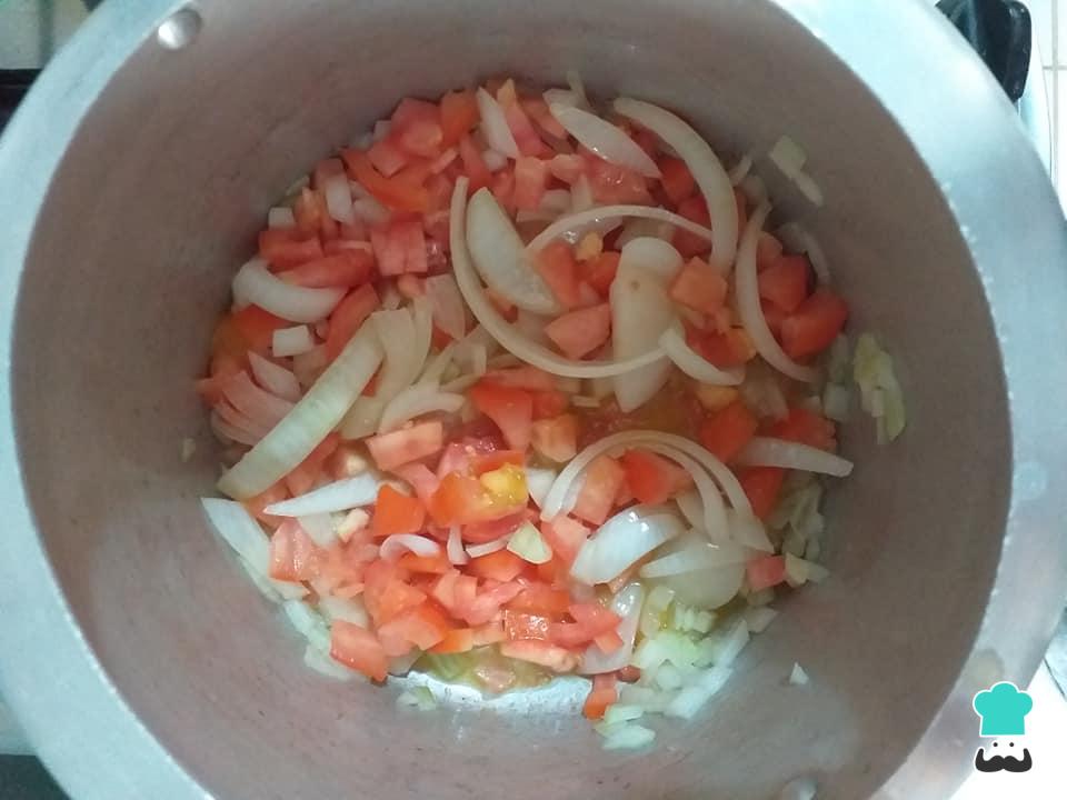 Na panela de pressão, adicione a manteiga e o restante do azeite de oliva e refogue a cebola e o tomate.
