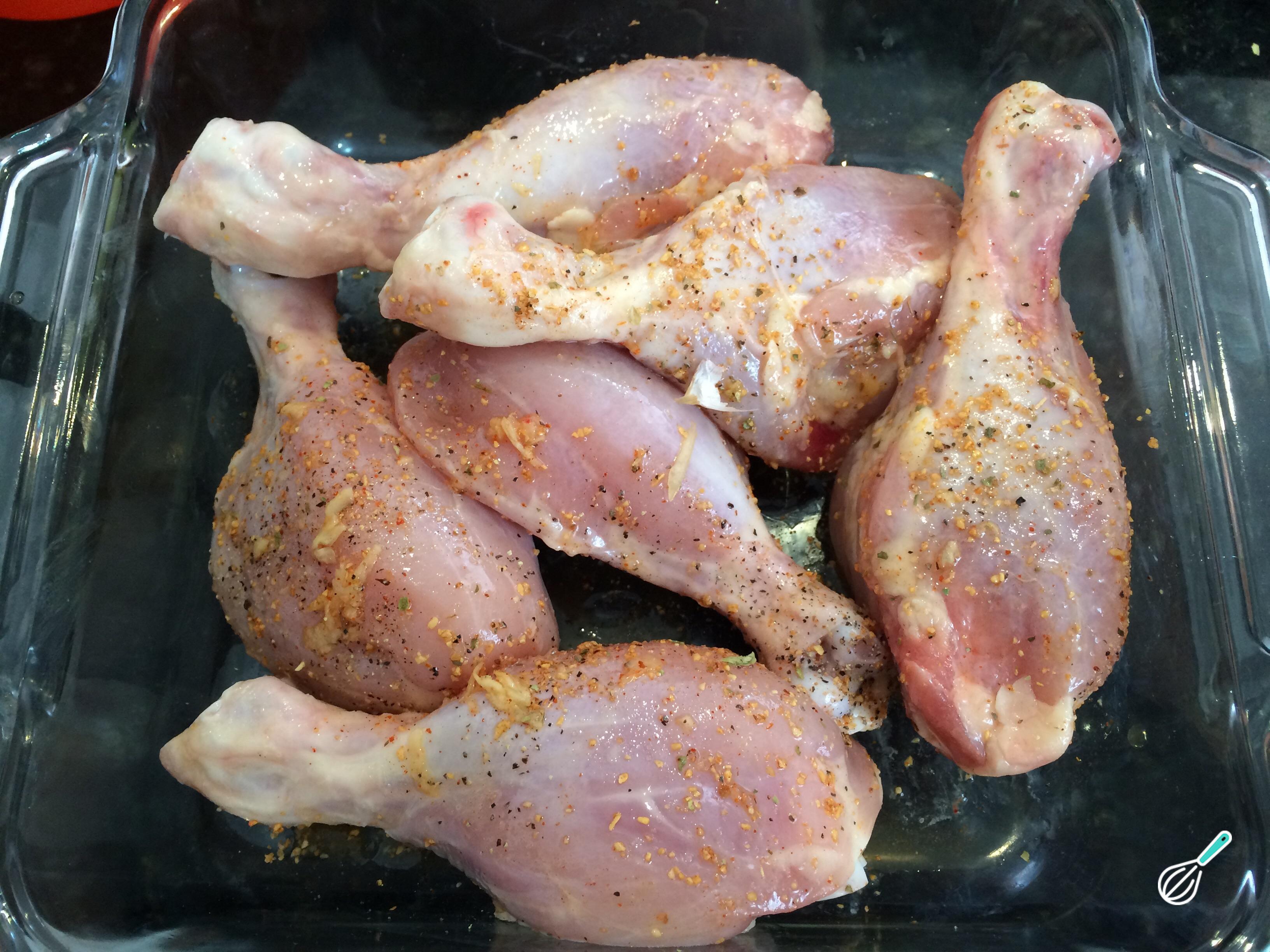 Para fazer coxa de frango assada no forno com batata, comece por limpar bem o frango. Tempere com alho (eu coloquei 3 dentes, mas você pode colocar mais ou menso de acordo com o seu gosto) e ervas de tempero a gosto.