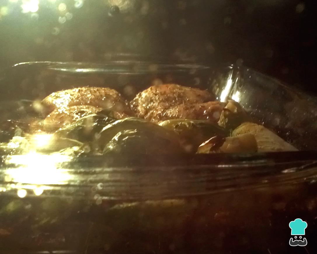 No final você pode ligar o modo grill do forno (calor apenas em cima) para dourar a pele da coxa e conseguir que ela fique crocante.