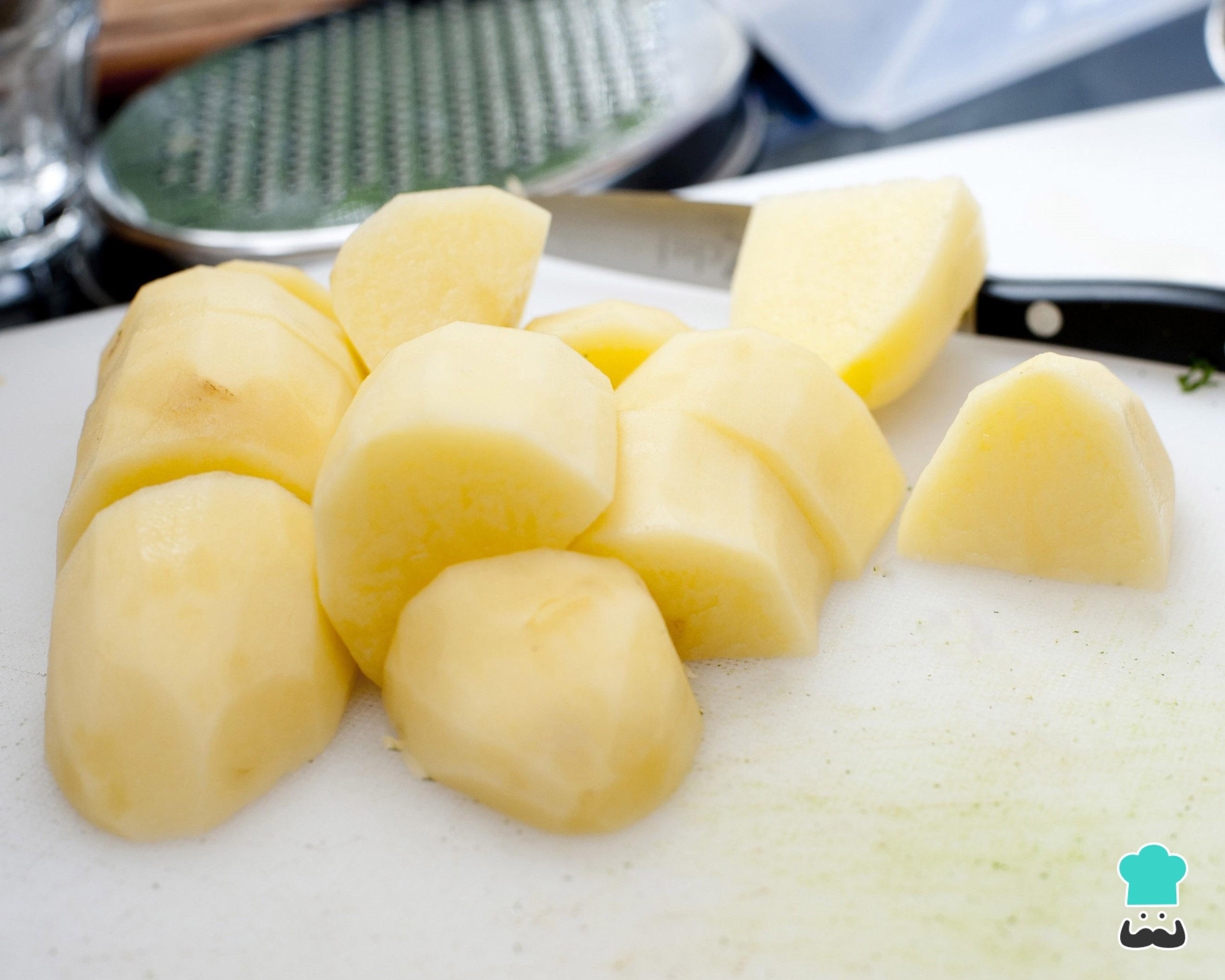 Comece a preparação da coxa de frango cozida com batata descascando a batata e a cenoura e cortando estes dois legumes em rodelas. Pique a cebola e os alhos em pedacinhos, eles serão usados para conferir mais sabor nesta receita com frango e legumes.