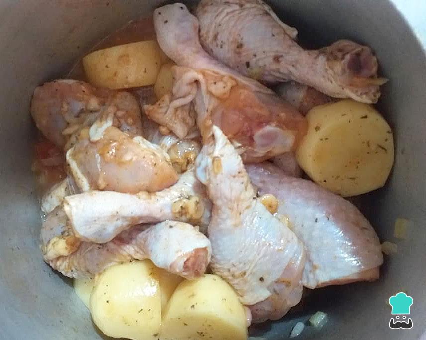 Em seguida adicione o frango na panela, tempere com a páprica, sal, pimenta e oréganos e misture com o refogado. Adicione também as batatas e as cenouras e cubra com água filtrada ou caldo de legumes.