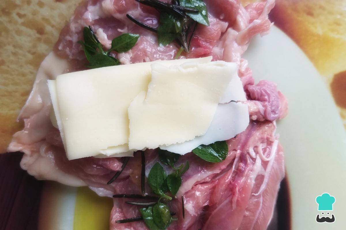 Em seguida corte a mussarela em 3 pedaços e distribua na parte de dentro de cada uma das coxas de frango desossadas.