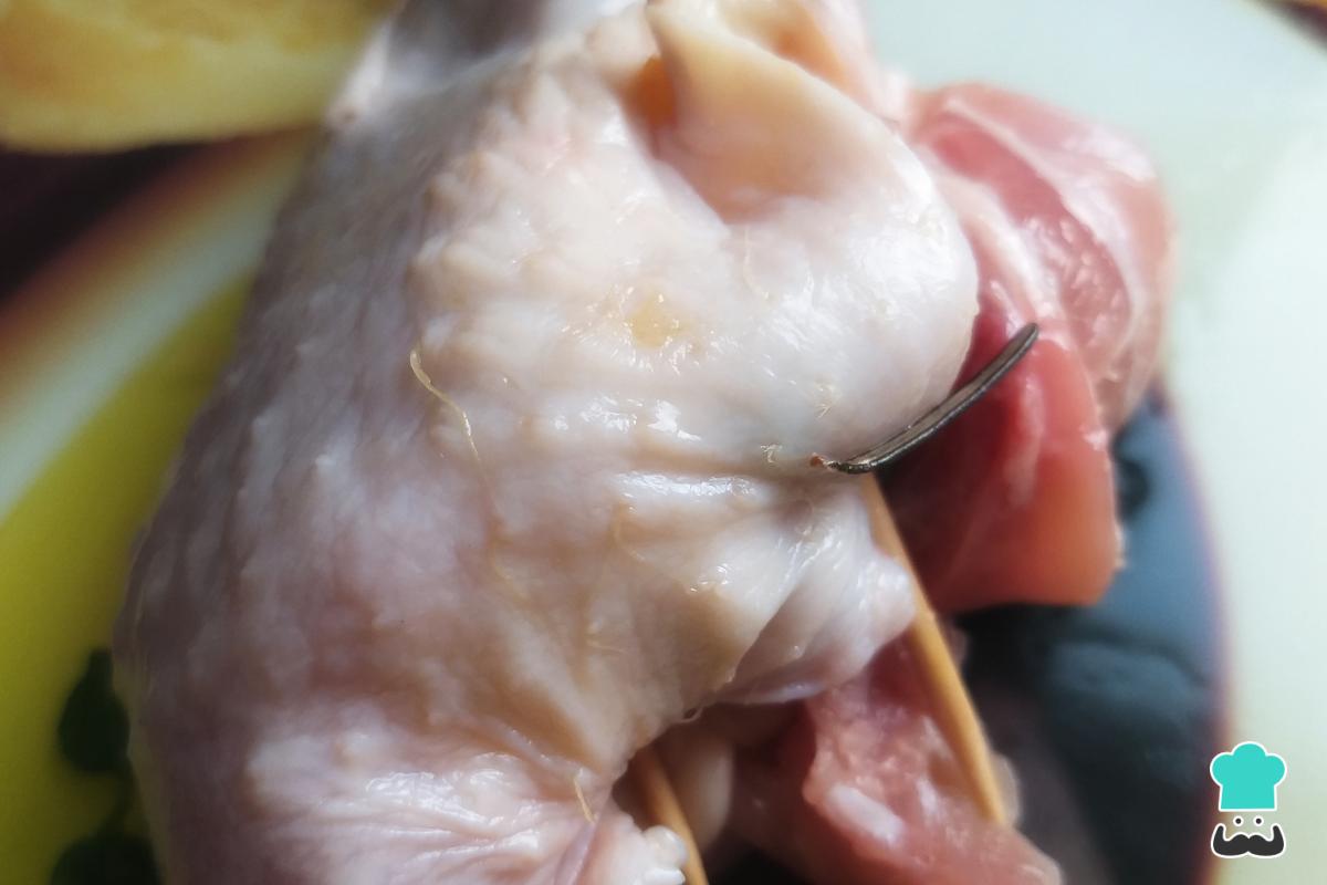 Feche as coxas de frango desossadas com o auxílio de palitos de dente.