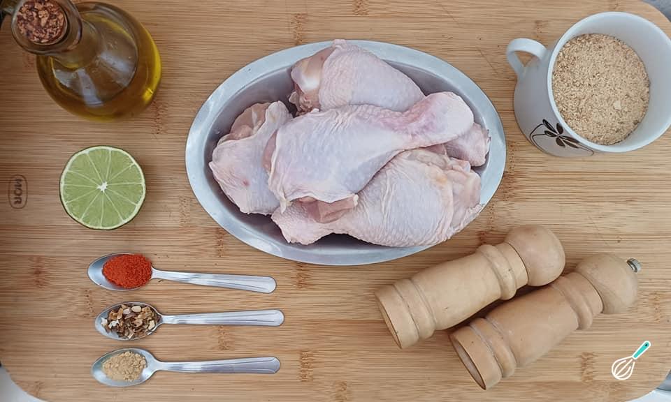 Comece separando todos os ingredientes para preparar a receita de coxa de frango empanada na airfryer.