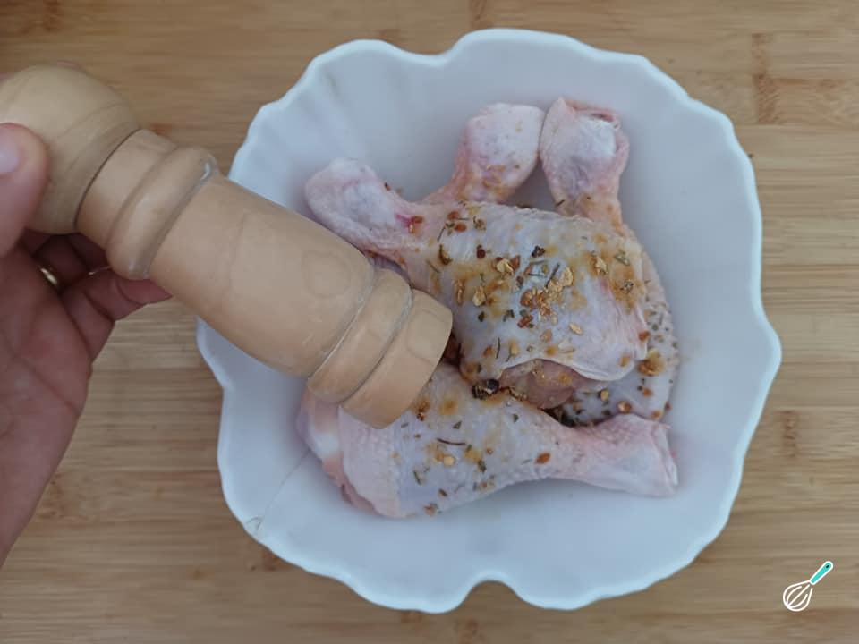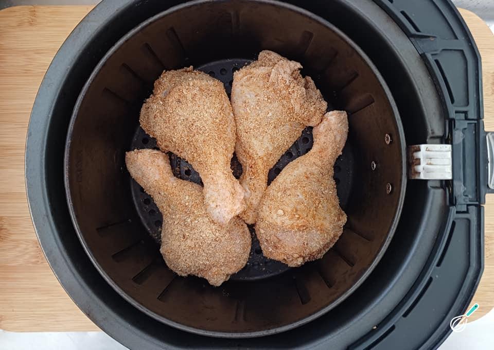 Acomode as coxas de frango no cesto da airfryer e asse-as por 25 minutos a 180 graus.