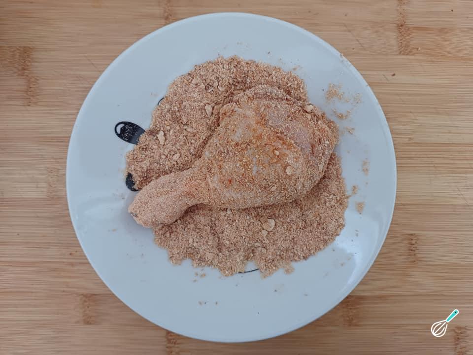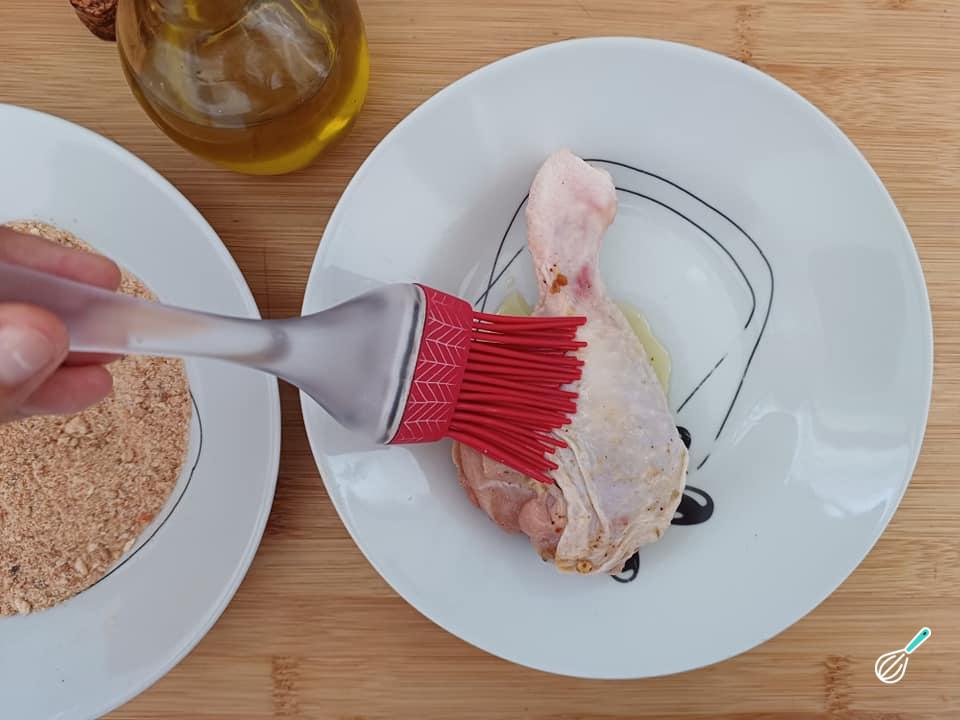Passe todas as coxas besuntadas por azeite de oliva numa misturinha de farinha de rosca com páprica e sal.