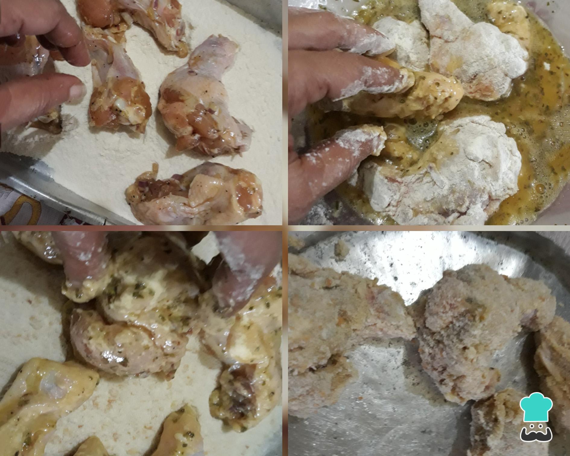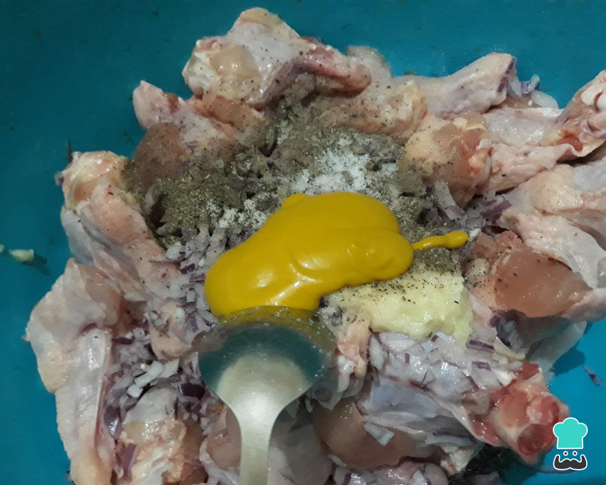Como temperar uma coxa de frango para fritar? Coloque as coxinhas em uma vasilha junto com os temperos: o sal, os alhos, a cebola, a pimenta do reino e a mostarda. Misture e deixe descansar de preferência por 3 horas ou mais - desse jeito você garante que a carne fica bem saborosa.
