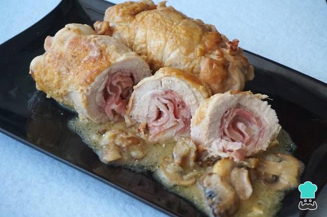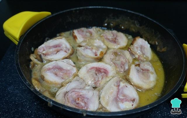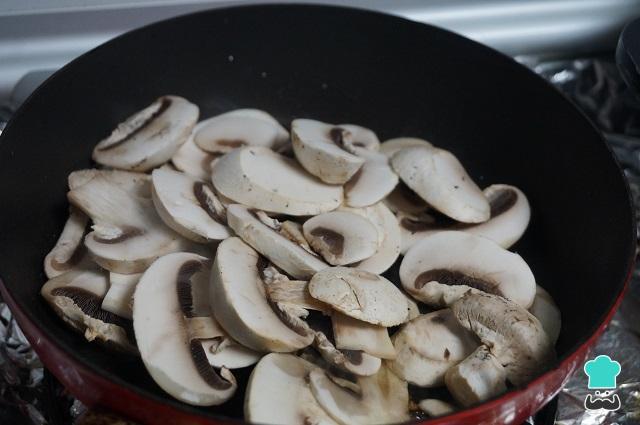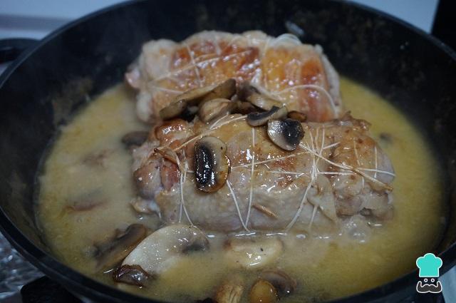 Para servir a coxa recheada ao molho de champignon refogue os champignons noutra frigideira. Para isso leve a frigideira ao fogo alto com um pouco de óleo ou manteiga e adicione os champignons. Deixe cozinhar, mexendo de vez em quando, até murcharem. Tempere a gosto com sal e pimenta.