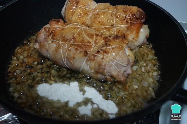 Em seguida baixe o fogo para médio e adicione na frigideira a cebola picadinha, para começar a preparar o molho para as coxas de frango recheadas. Quando a cebola estiver dourada adicione a farinha de trigo e misture, ela ajudará a espessar o molho.