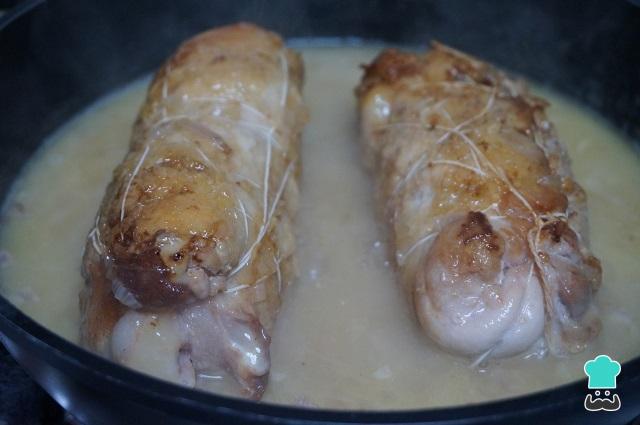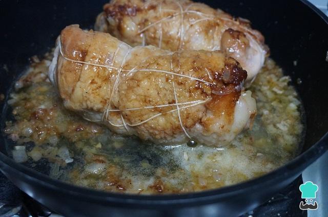 Adicione agora os líquidos: primeiro o vinho branco e deixe ferver para liberar o álcool e soltar todos os sabores grudados na frigideira, depois coloque o caldo de galinha ou a água para continuar cozinhando a coxa recheada.