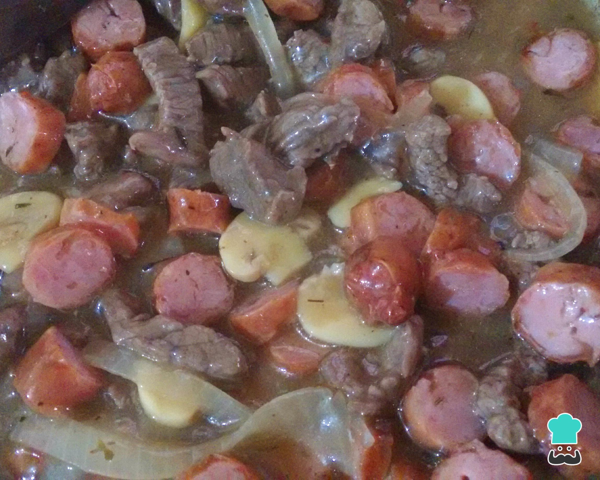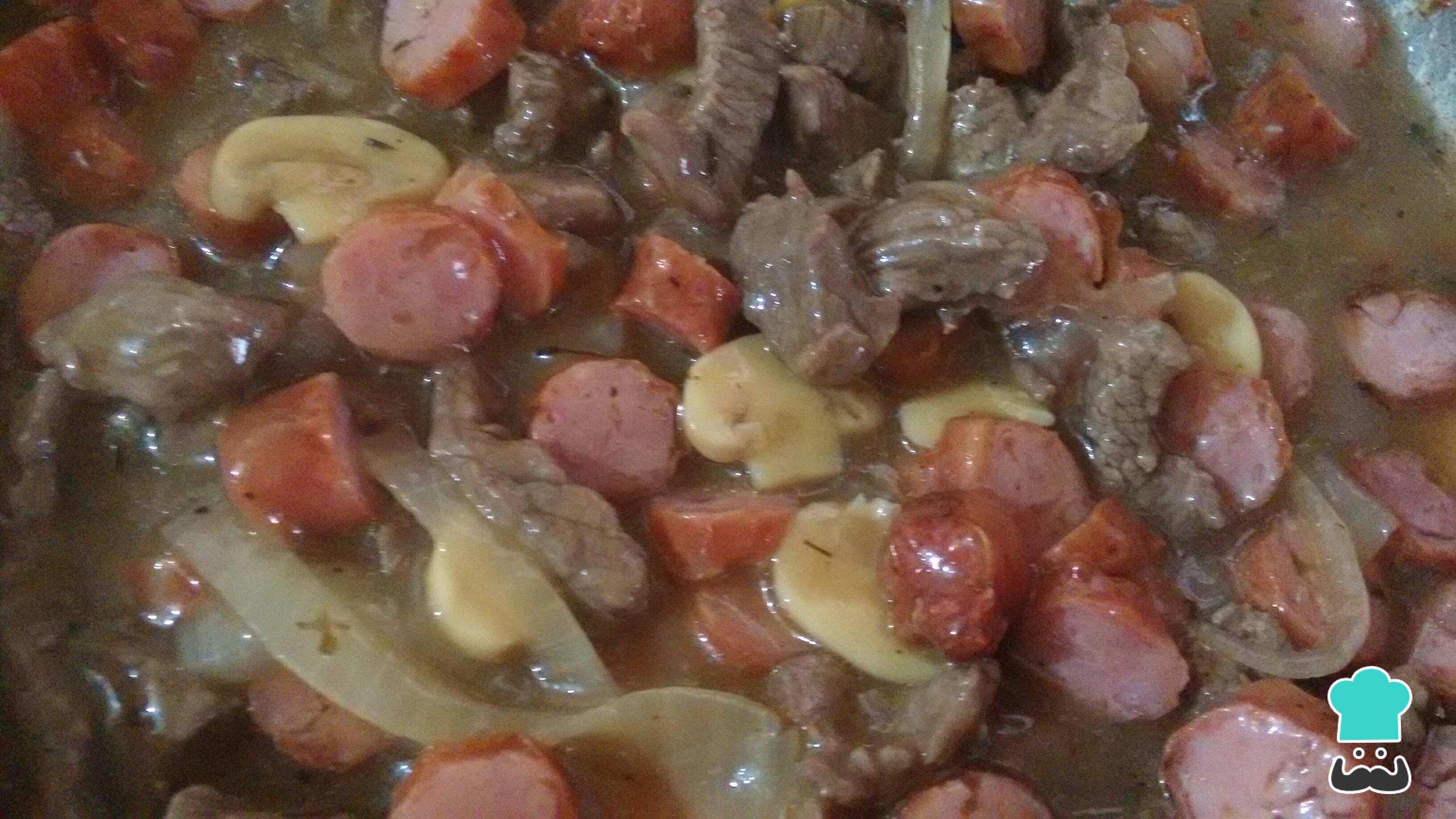 Junte ao molho a calabresa picada em rodelas e a carne, deixe mais um minuto no fogo e pode servir! Saboreie esta receita de coxão mole ao molho acebolado acompanhando com farofa de feijão com couve e bacon ou quiabo refogado com molho. Bom apetite e diga nos cometários o que você achou!