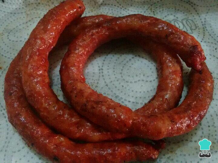 Prepare esta receita de coxão mole ao molho acebolado começando por fritar a linguiça inteira. Reserve.