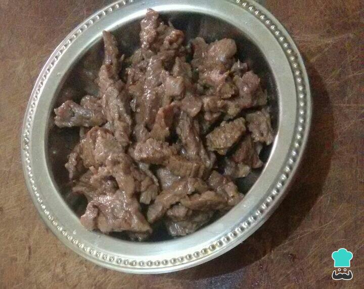 Corte a carne em pedaços e tempere com um dos alhos e sal. Frite somente até mudar de cor (para não ficar dura) e reserve.