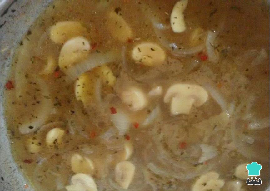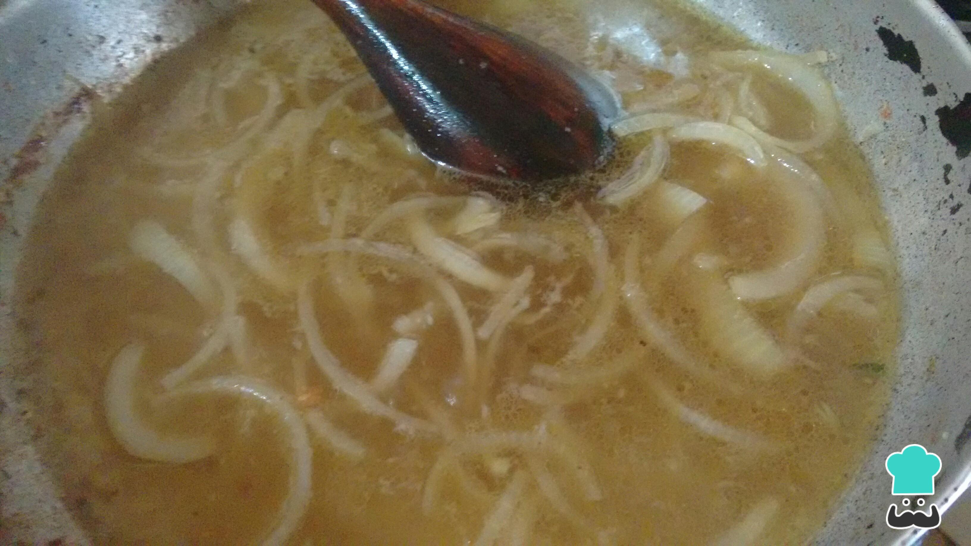 Ferva a água e dissolva nela o caldo de carne. Enquanto isso, na panela em que fritou a carne coloque um pouco de azeite e frite o restante do alho e a cebola até ela ficar translúcida. Acrescente a água com o caldo e abaixe o fogo.