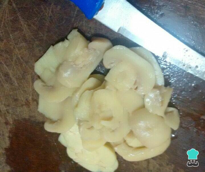 O passo seguinte da receita de coxão mole ao molho acebolado é cortar os champignons e juntar ao molho acebolado anterior.