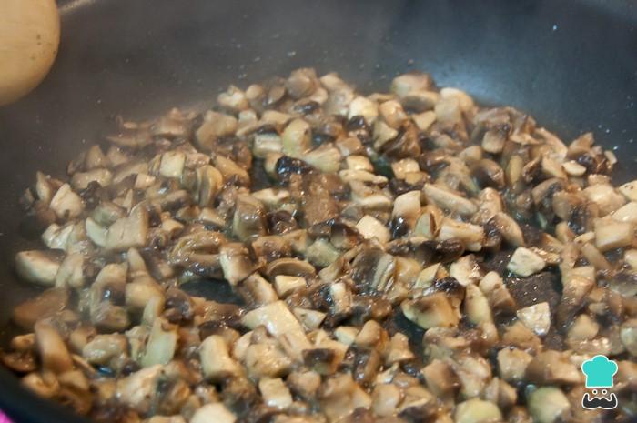 À parte, refogue os cogumelos picados em uma panela ou frigideira com a manteiga e óleo. Tampe, para que eles libertem todo o suco e, após 2-3 minutos, adicione a farinha de trigo e mexa.