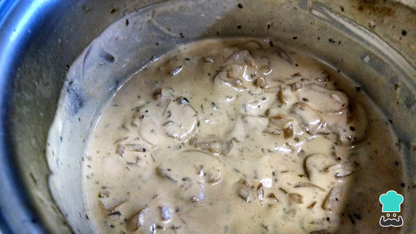 Quando se tiver formado uma pasta, adicione o caldo de galinha, o creme de leite, sal, pimenta e páprica, para fazer o molho de cogumelos que dará o toque especial a esta receita. Misture tudo muito bem, depoisadicione o queijo e a carne, tampe e deixe cozinhar por mais 10 minutos.