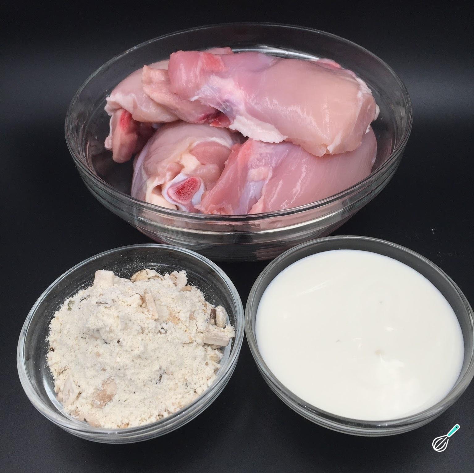 Ligue o forno a 200 graus e junte todos os ingredientes necessários para a receita de coxas de frango com creme de leite.