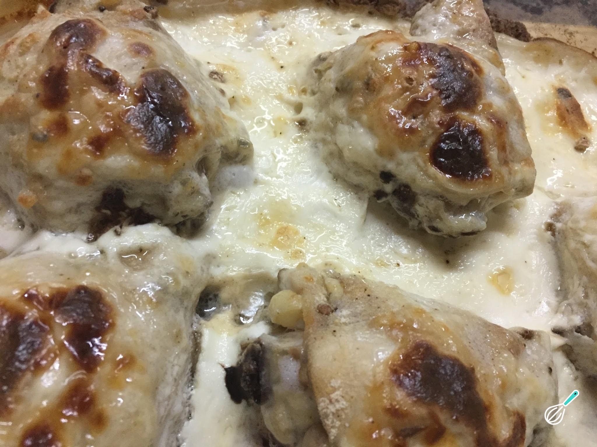 Adicione o creme de leite por cima das coxas de frango. Leve ao forno para assar por 20 minutos ou até as coxas de frango ficarem douradas.