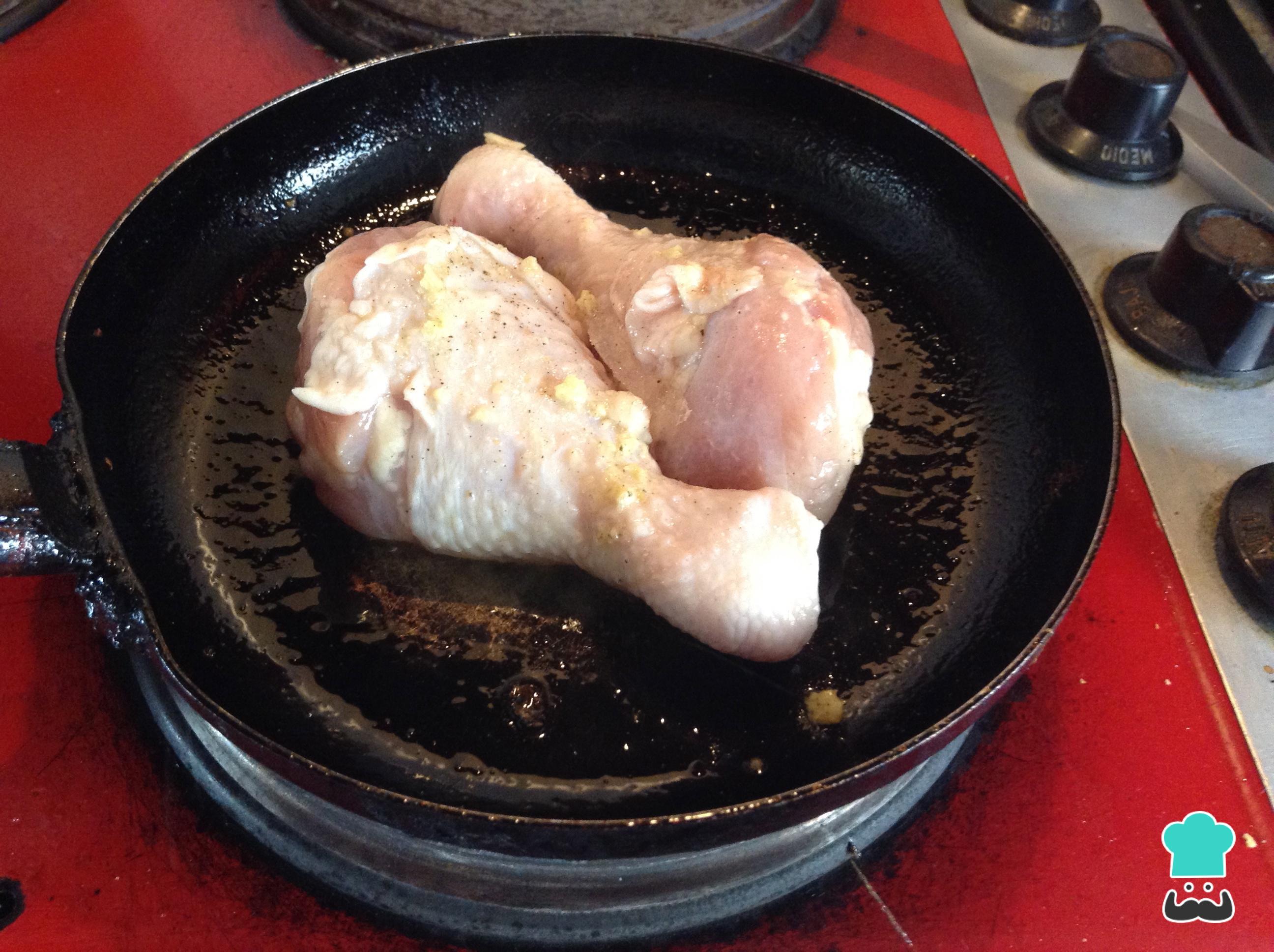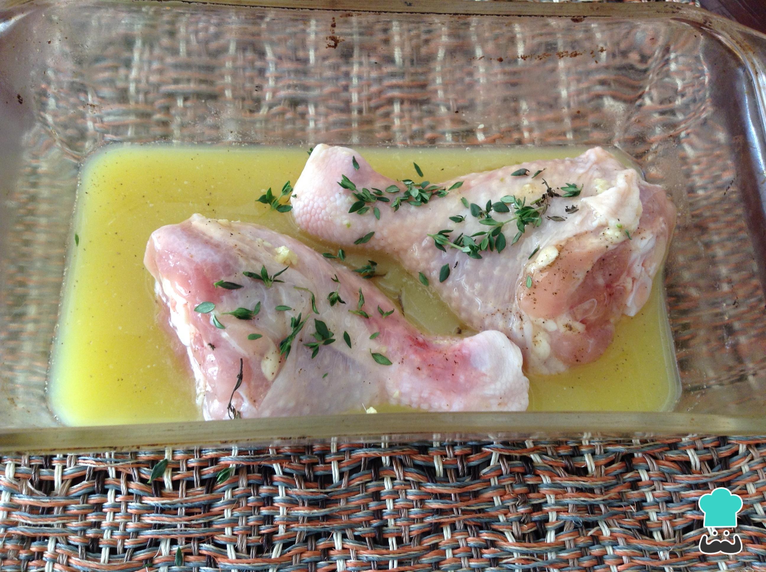 Tempere as coxas com pasta de alho, sal e pimenta. Coloque dourando em uma frigideira ao fogo médio com um pouco de óleo, passo importante para manter os sucos da carne quando for ao forno.