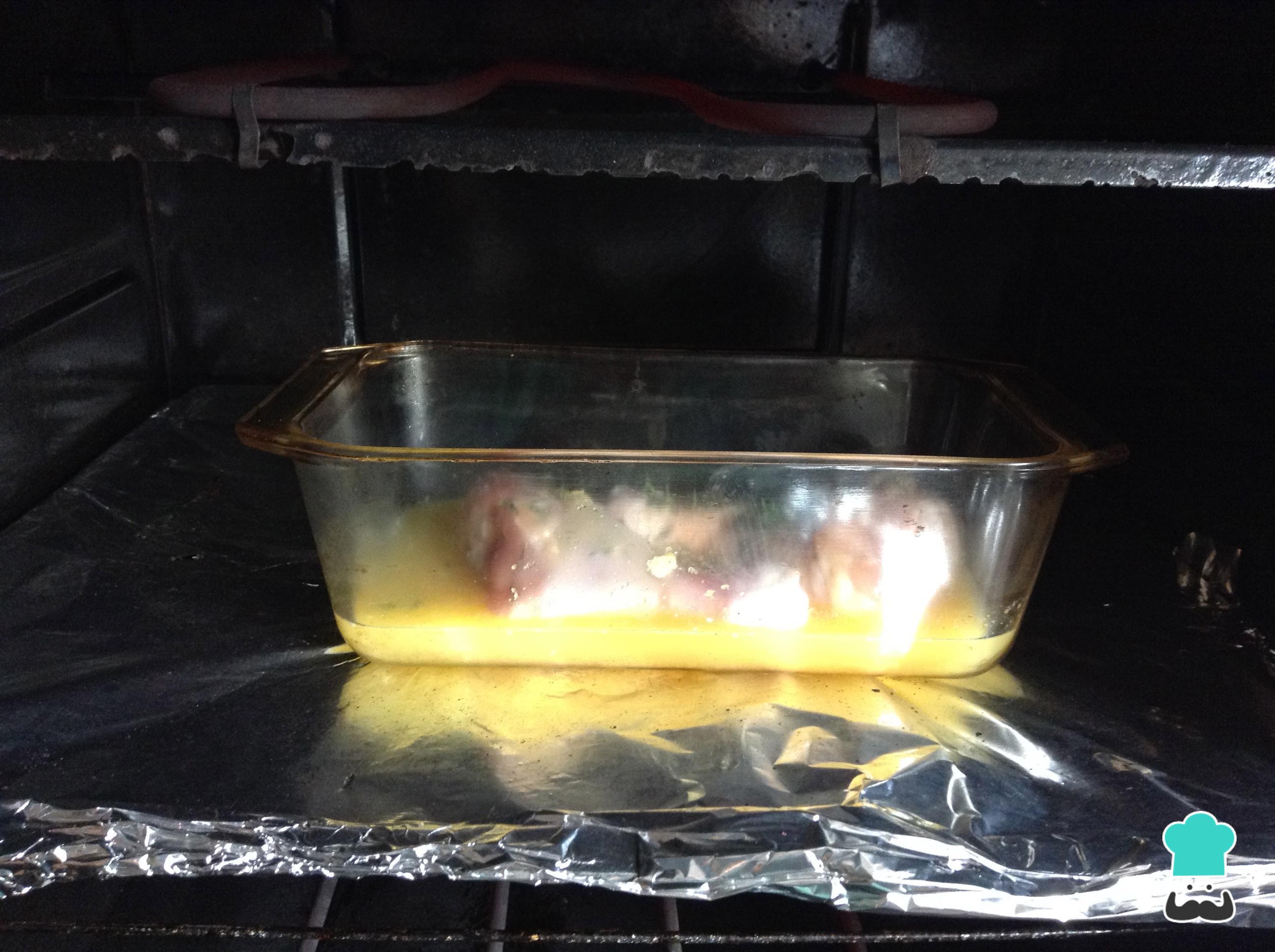 Após o passo anterior continue preparando esta receita de coxas de frango com mel: coloque a carne em um refratário com o suco de laranja, pincele sobre ela o mel e polvilhe o tomilho fresco.