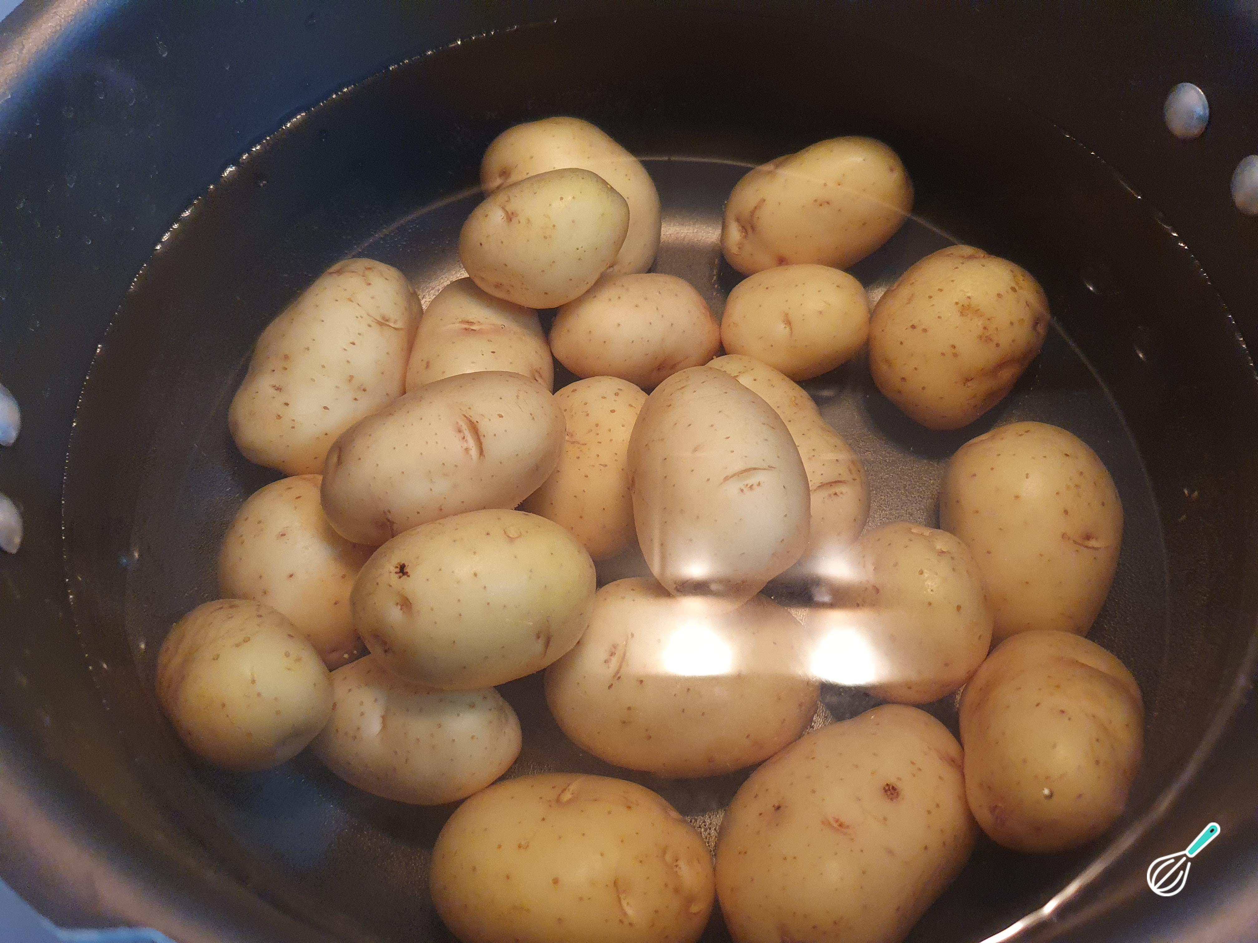 Para as batatas: Lave bem e leve para cozinhar com casca na água e sal.