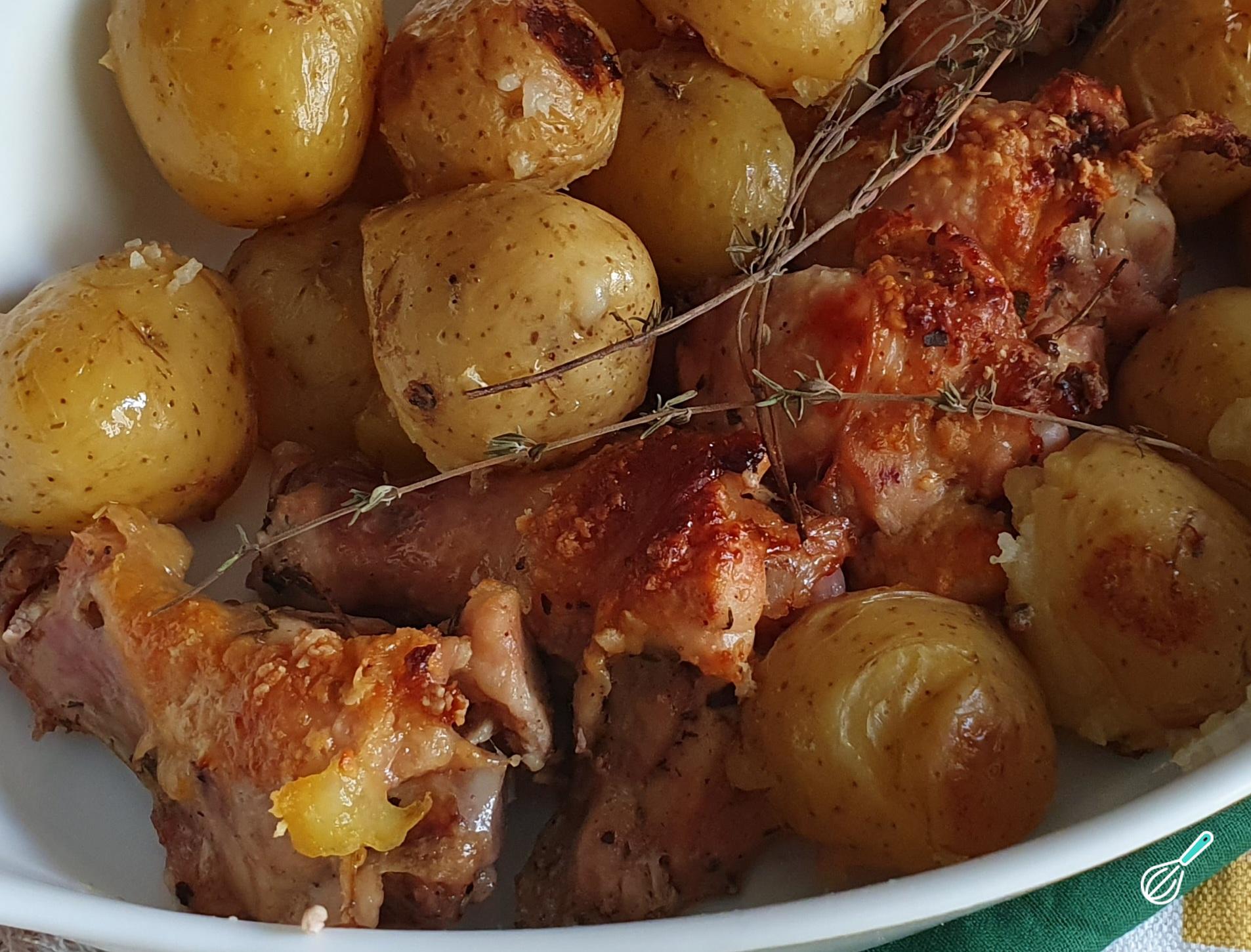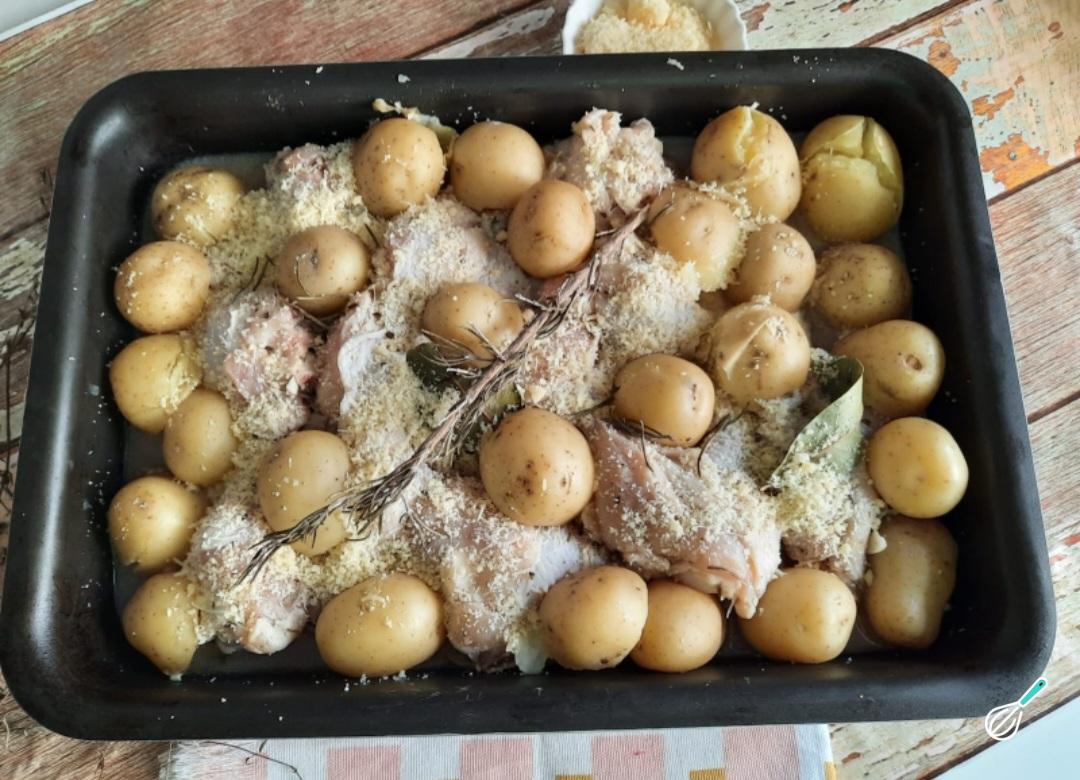 Depois que as batatas estiverem cozidas, aproximadamente 15-20 minutos, arrume no tabuleiro junto com as coxinhas da asa .