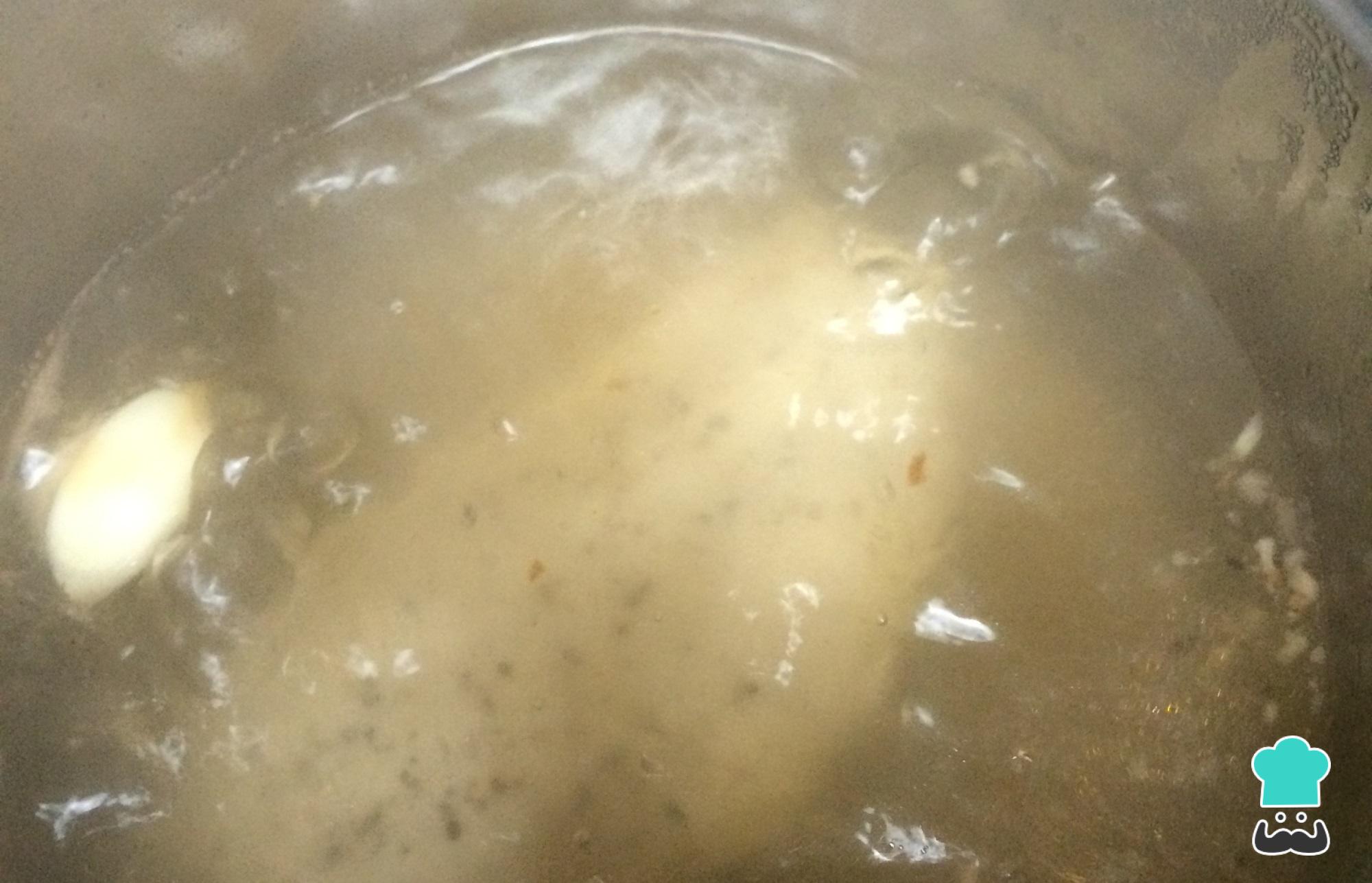 O primeiro passo da receita de coxinha de batata da Palmirinha é colocar o peito de frango cozendo em uma panela com 1/2 litro de água, o tablete de caldo, um dente de alho e um pouco de sal.