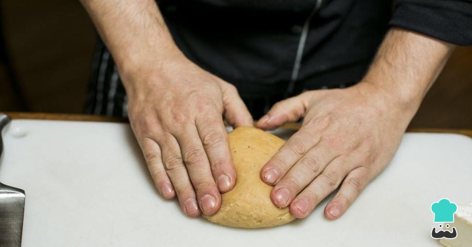 Transfira a massa para uma superfície de trabalho limpa e untada com óleo. Amasse um pouco, adicione a batata em purê e volte a amassar, para incorporar bem. Reserve.