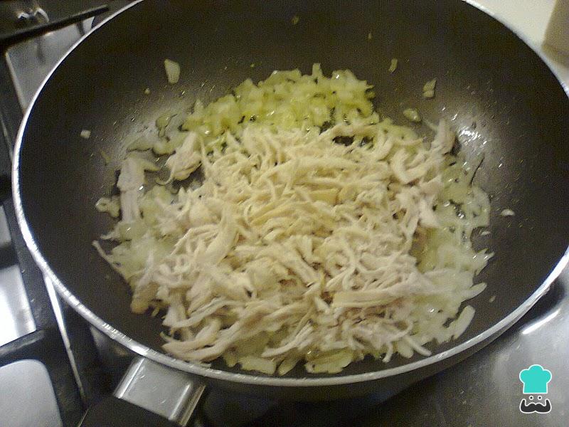 Quando a cebola estiver macia, adicione o frango desfiado e os tomates picados. Cozinhe durante 5 minutos, mexendo de vez em quando. Desligue, retifique o sabor com pimenta e sal e adicione a salsinha.