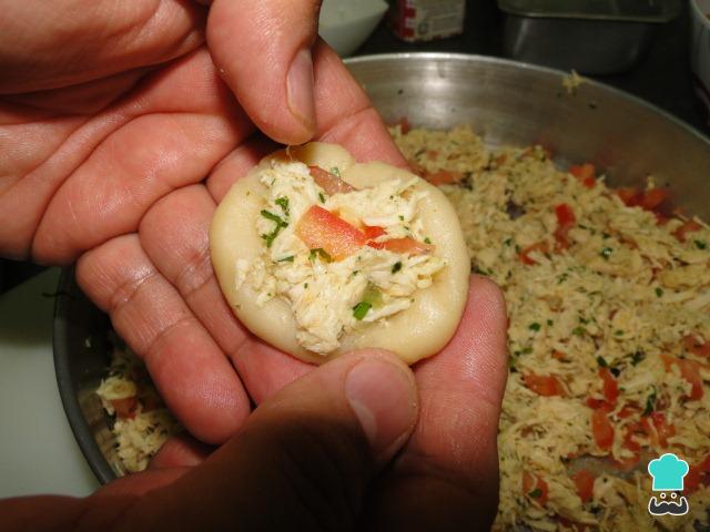 Quando o recheio estiver morno ou frio, abra na palma da mão uma porção da massa de coxinha de batata, coloque o recheio e feche. Repita até esgotar a massa e o recheio.
