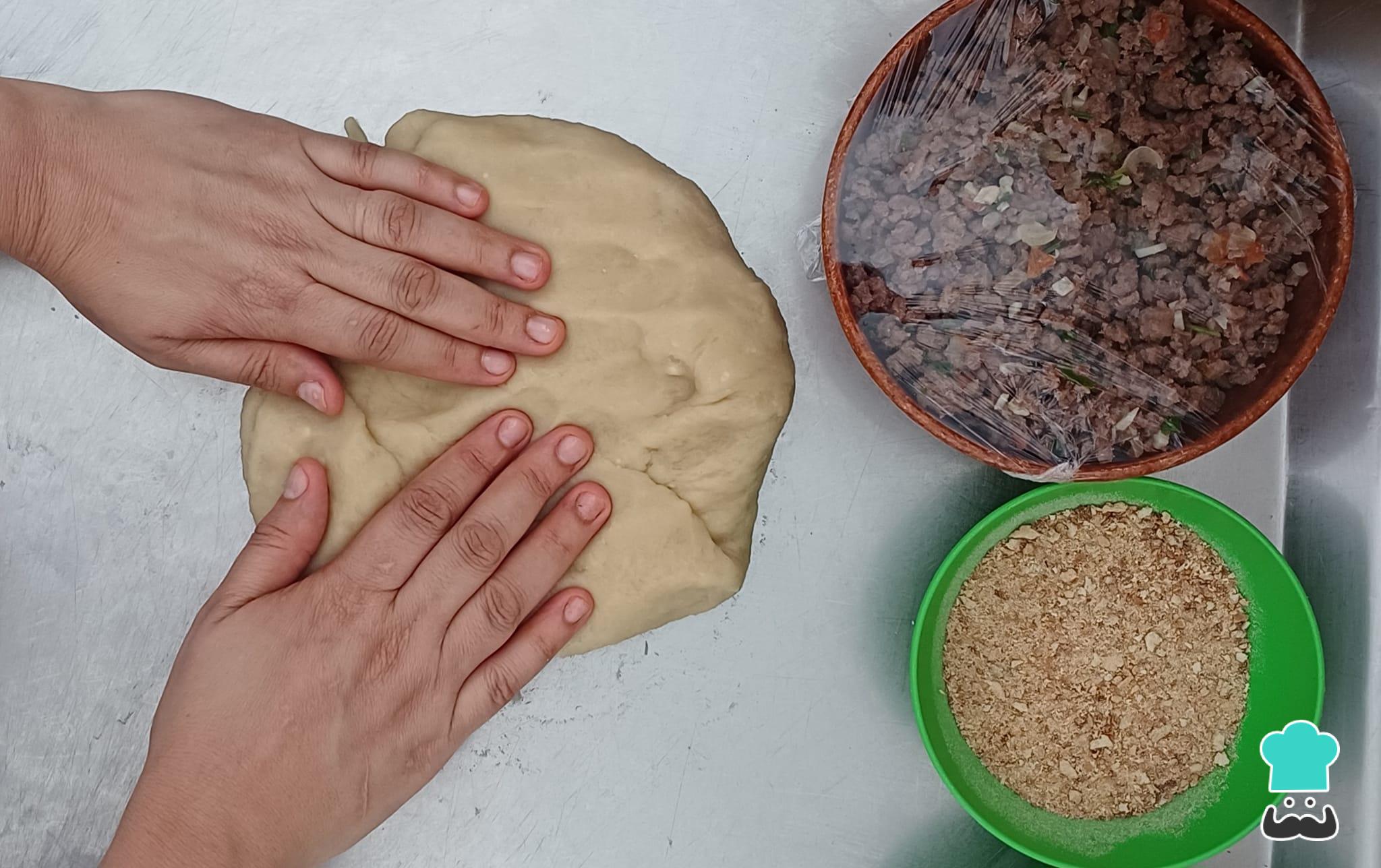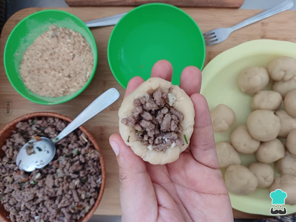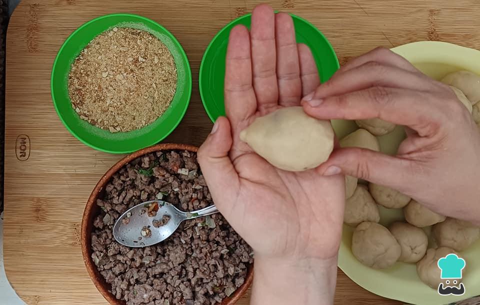 Pegue porções da massa (de preferência em tamanhos iguais) e abra na palma da mão formando uma cavidade para preencher com a carne moída.