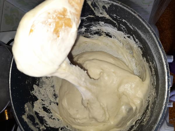 De seguida acrescente a farinha de arroz de uma só vez e mexa vigorosamente até soltar do fundo da panela. Pode adicionar um pouco de óleo para ajudar ou mais farinha de arroz se a massa estiver muito mole.