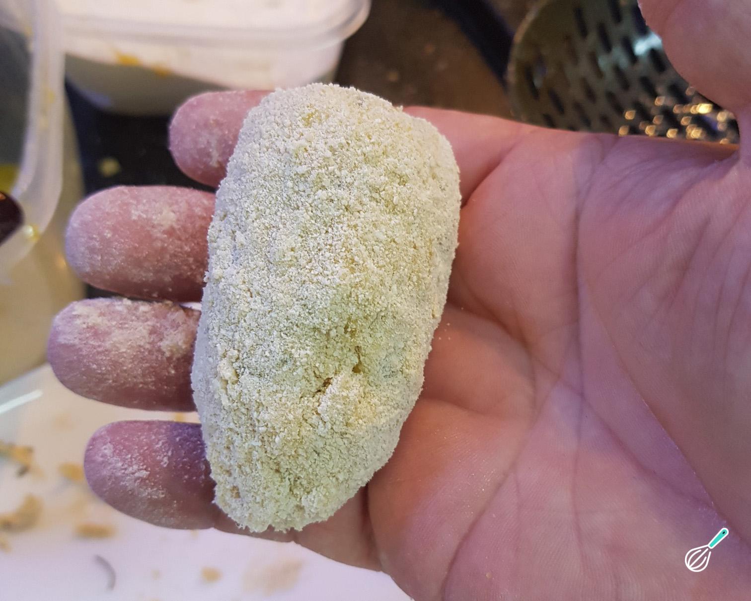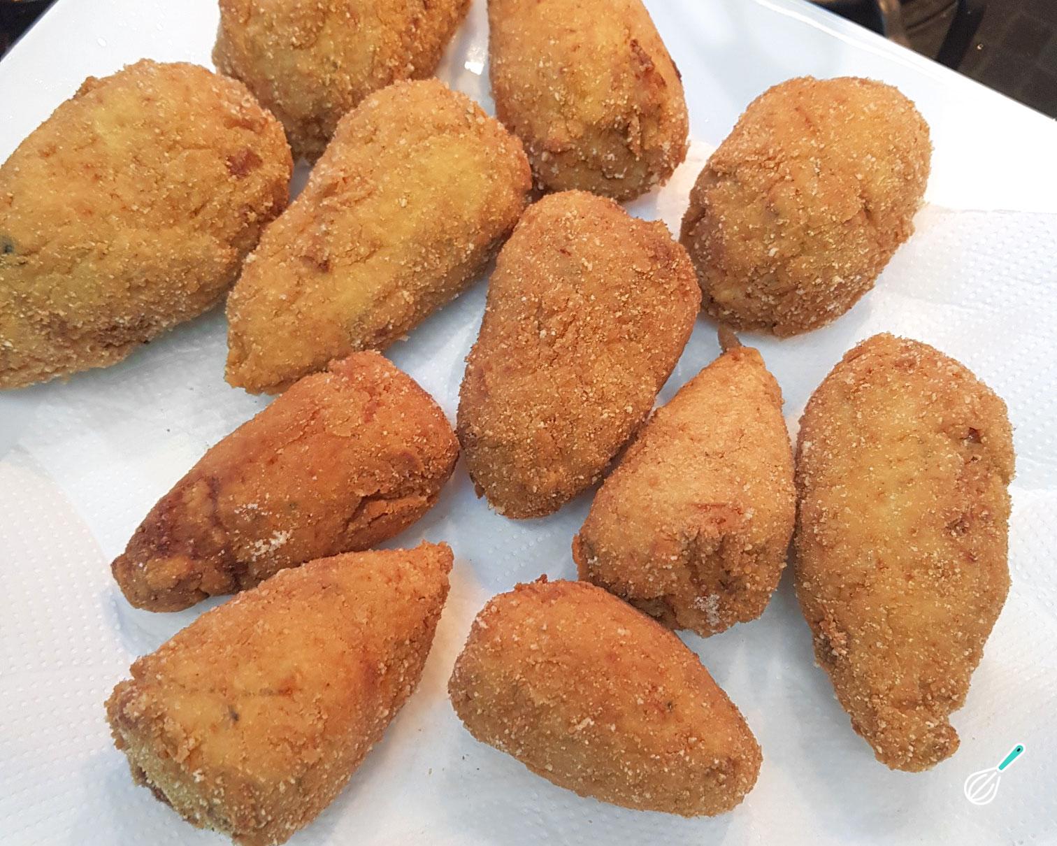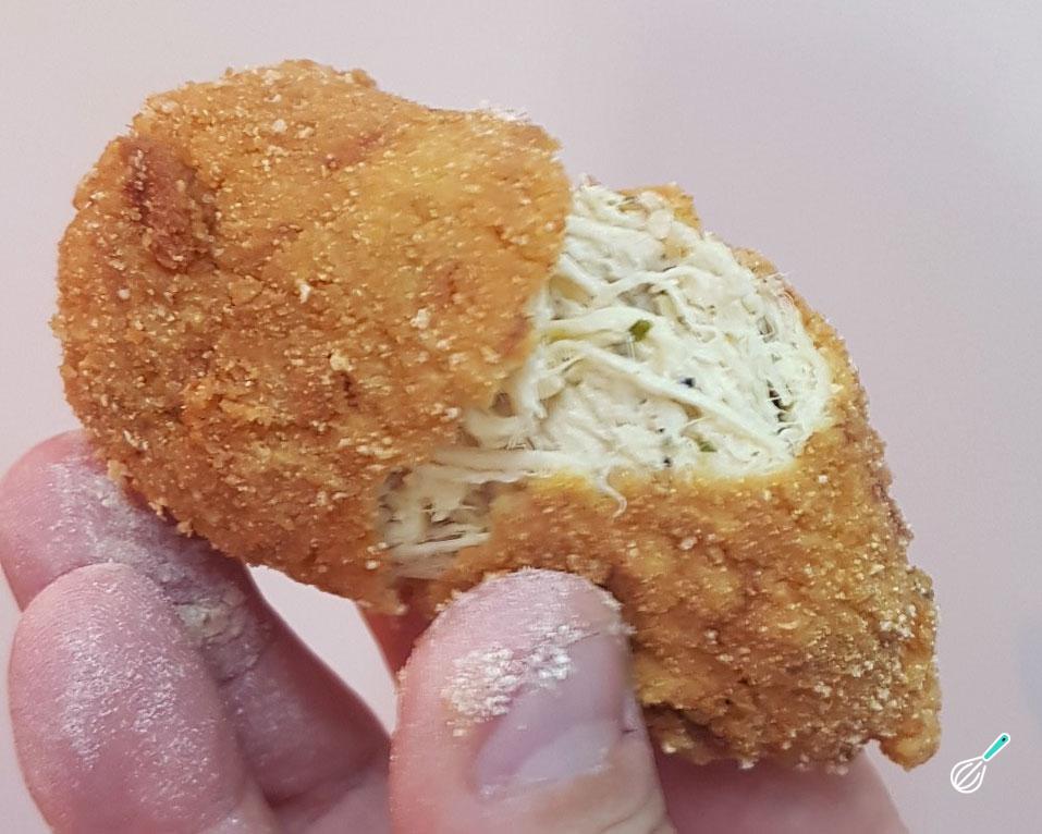Após estar tudo pronto coloque o óleo para esquentar até ficar bem quente. Agora é só enrolar o recheio de frango na mão e passar primeiro no ovo, depois na farinha de rosca e colocar para fritar até dourar.