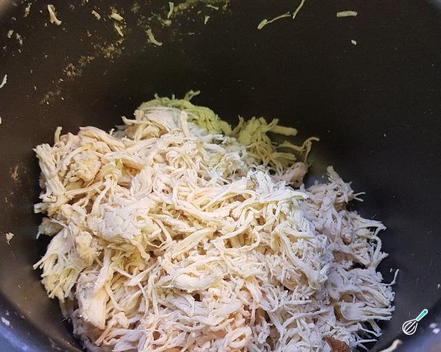 Após o frango estar bem cozido escorra todo o caldo e reserve ele. Deixe o frango na panela, volte a tampar e chacoalhe a panela com foça, para cima e para baixo, por aproximadamente 1 minuto - esse é um truque para desfiar frango facilmente.