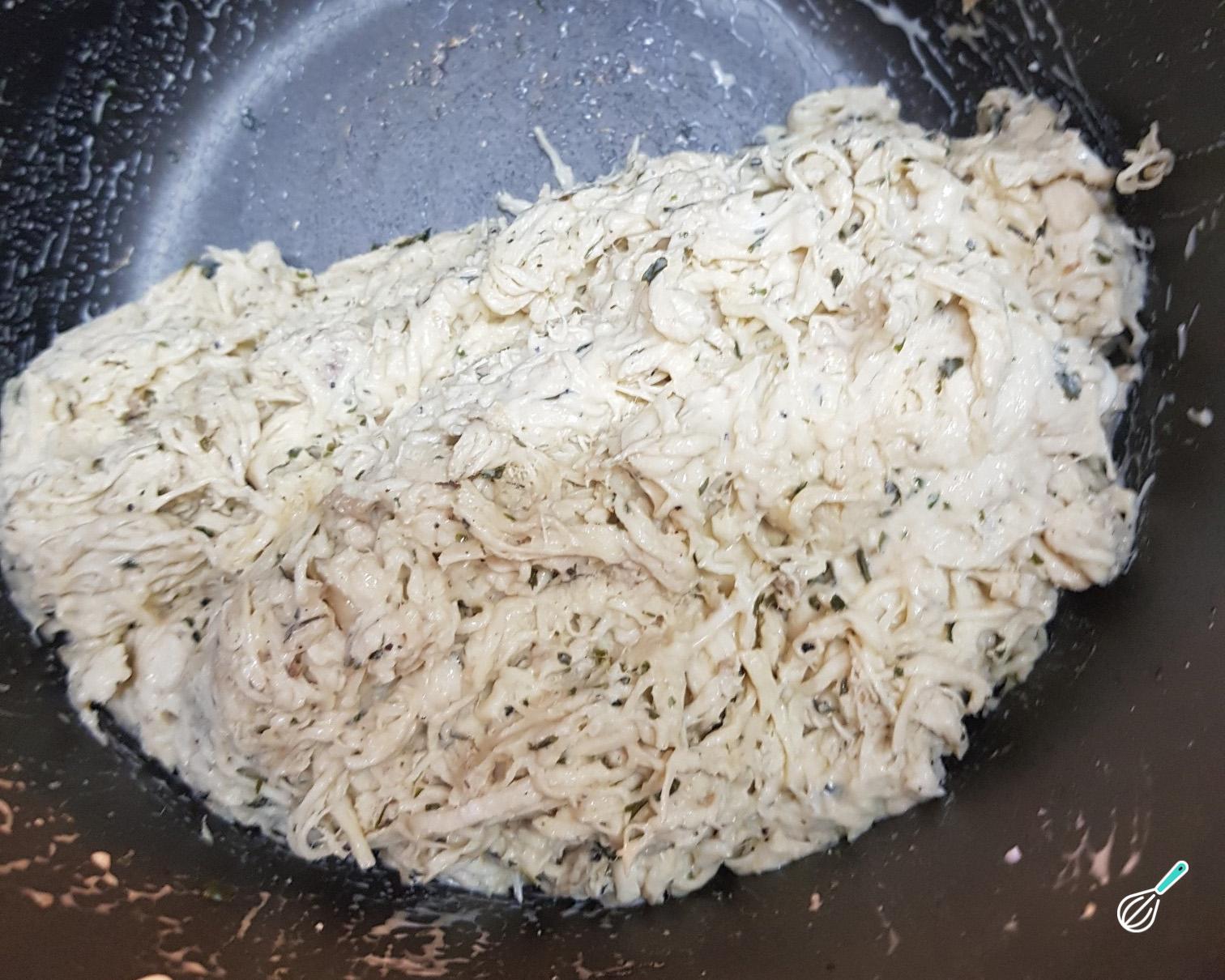 Coloque o frango desfiado e misture bem no refogado. Depois acrescente o requeijão cremoso e misture este recheio de frango para coxinha até ficar homogêneo, como na foto. Se necessário, acerte o sabor com sal e pimenta a gosto.