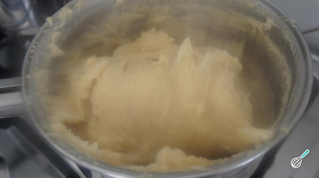 O primeiro passo desta receita saudável de coxinha de mandioca assada é levar ao fogo uma panela com a água, a manteiga e os tabletes de caldo. Quando ferver adicione a farinha e a mandioca de uma só vez e mexa sem parar por 5 minutos, ou até desgrudar da panela. Transfira para uma assadeira untada e deixe esfriar.