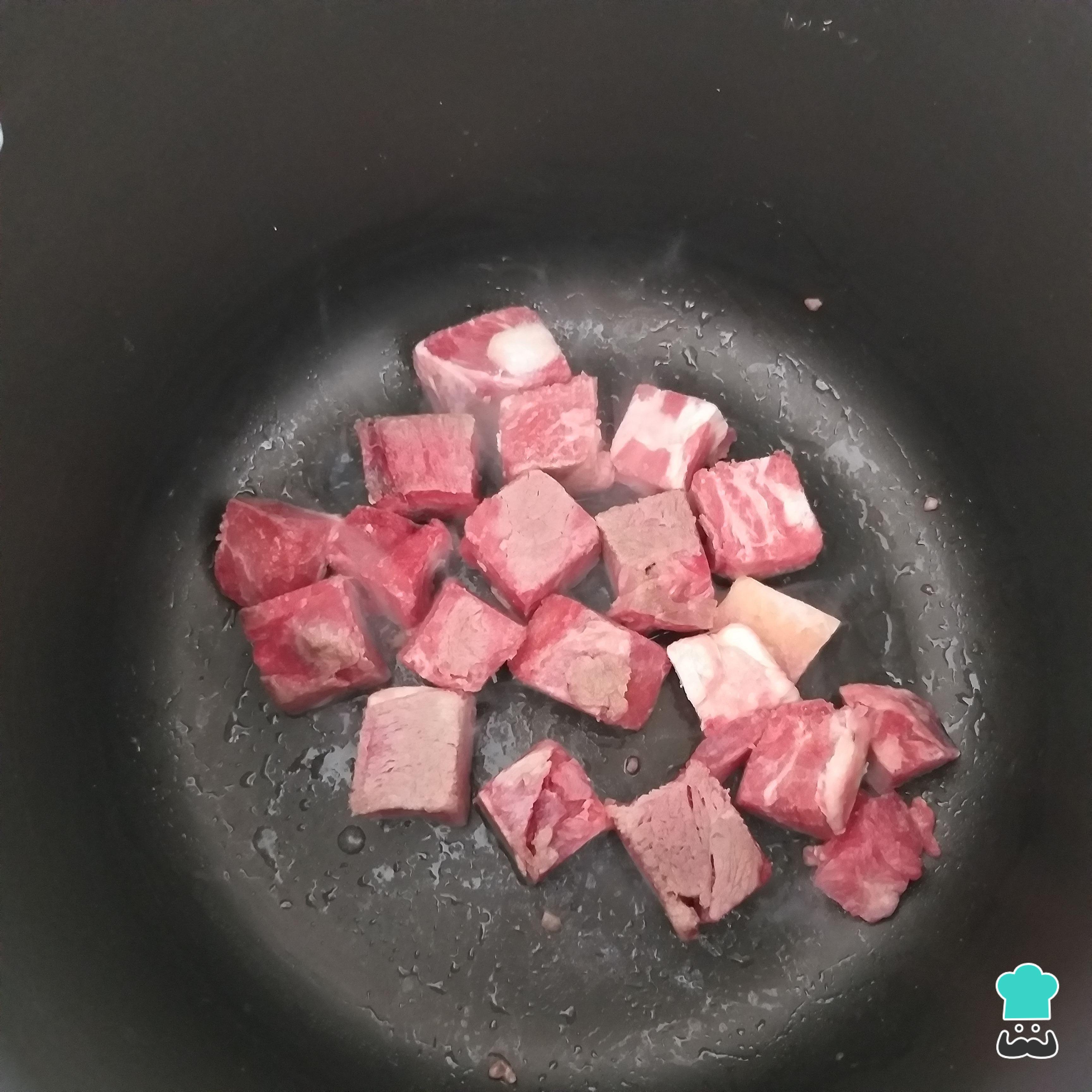 Inicialmente é preciso selar a carne, para que ela fique mais macia após o cozimento. Para isso leve uma panela de pressão ao fogo médio, coloque um fio de óleo e acrescente alguns pedaços de carne. Doure a carne em todos os lados (a isso se chama 'selar'), retire da panela e reserve. Repita o processo até selar toda a carne.