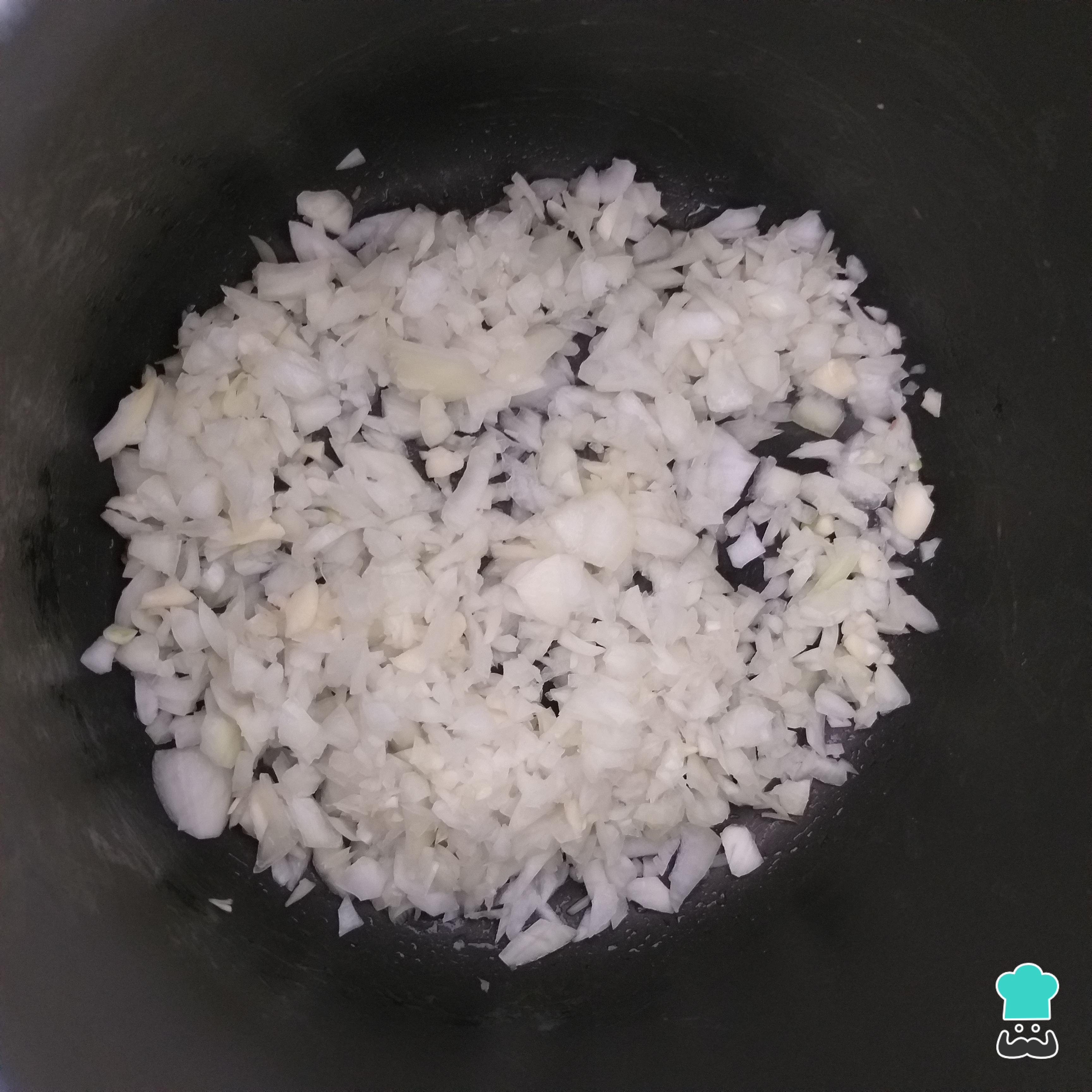 Na mesma panela (sem a carne), coloque mais um fio de óleo e refogue o alho e a cebola.
