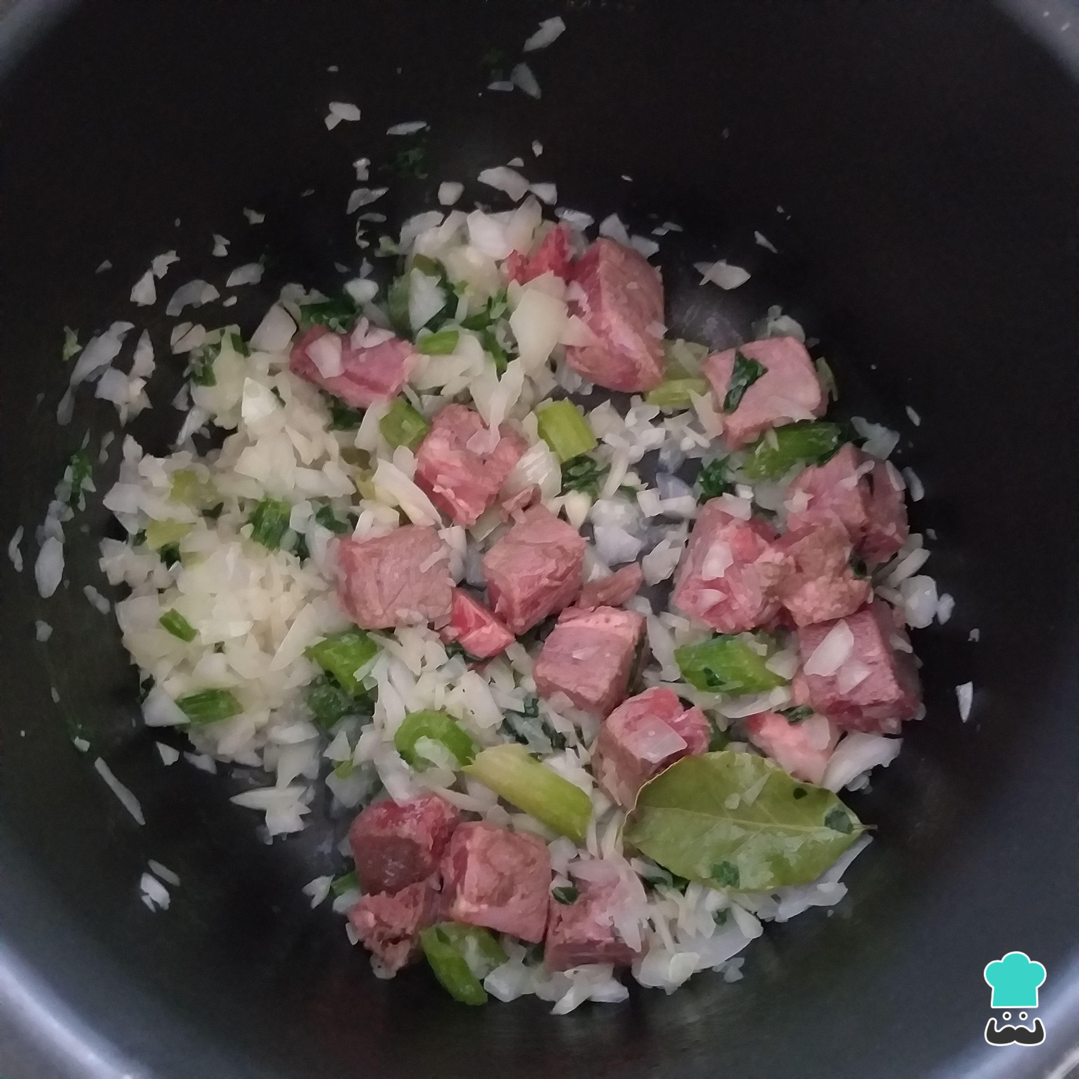 Coloque a carne novamente (junto com o líquido que pode ter se acumulado) e acrescente o louro, o salsão e o sal.