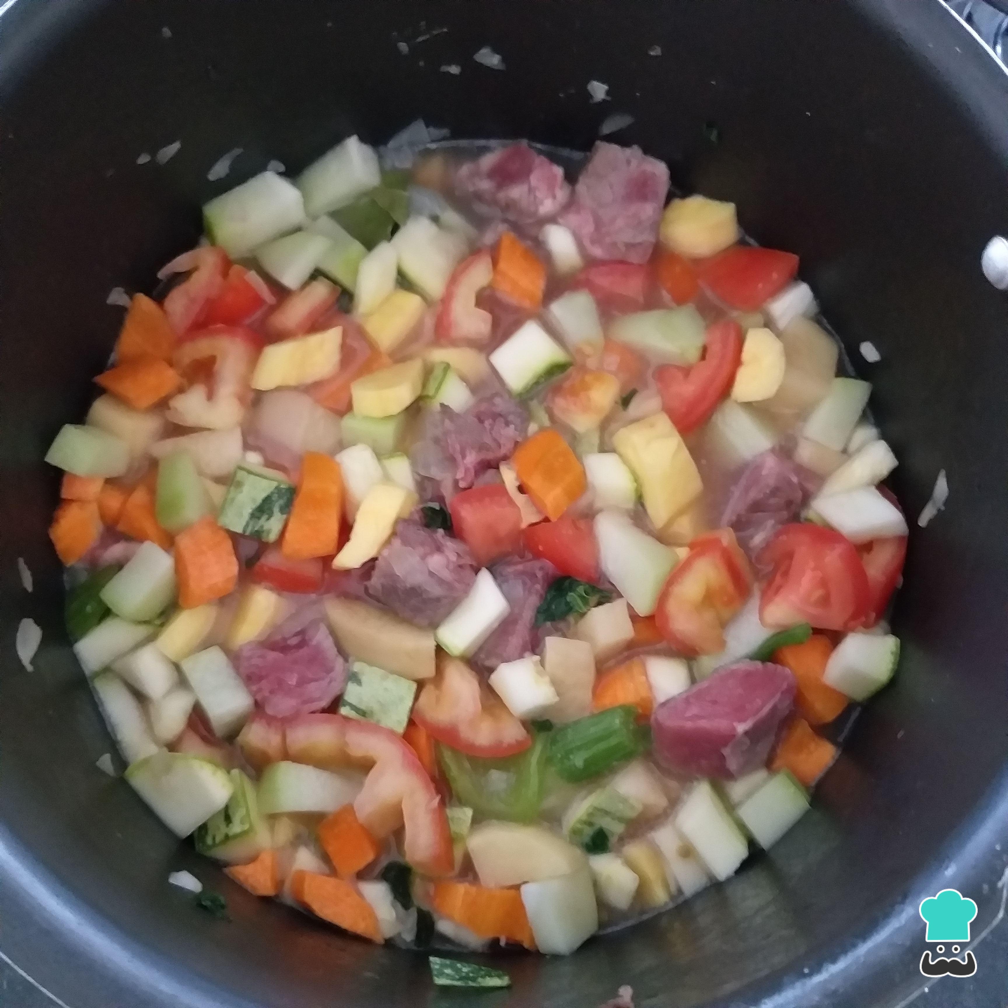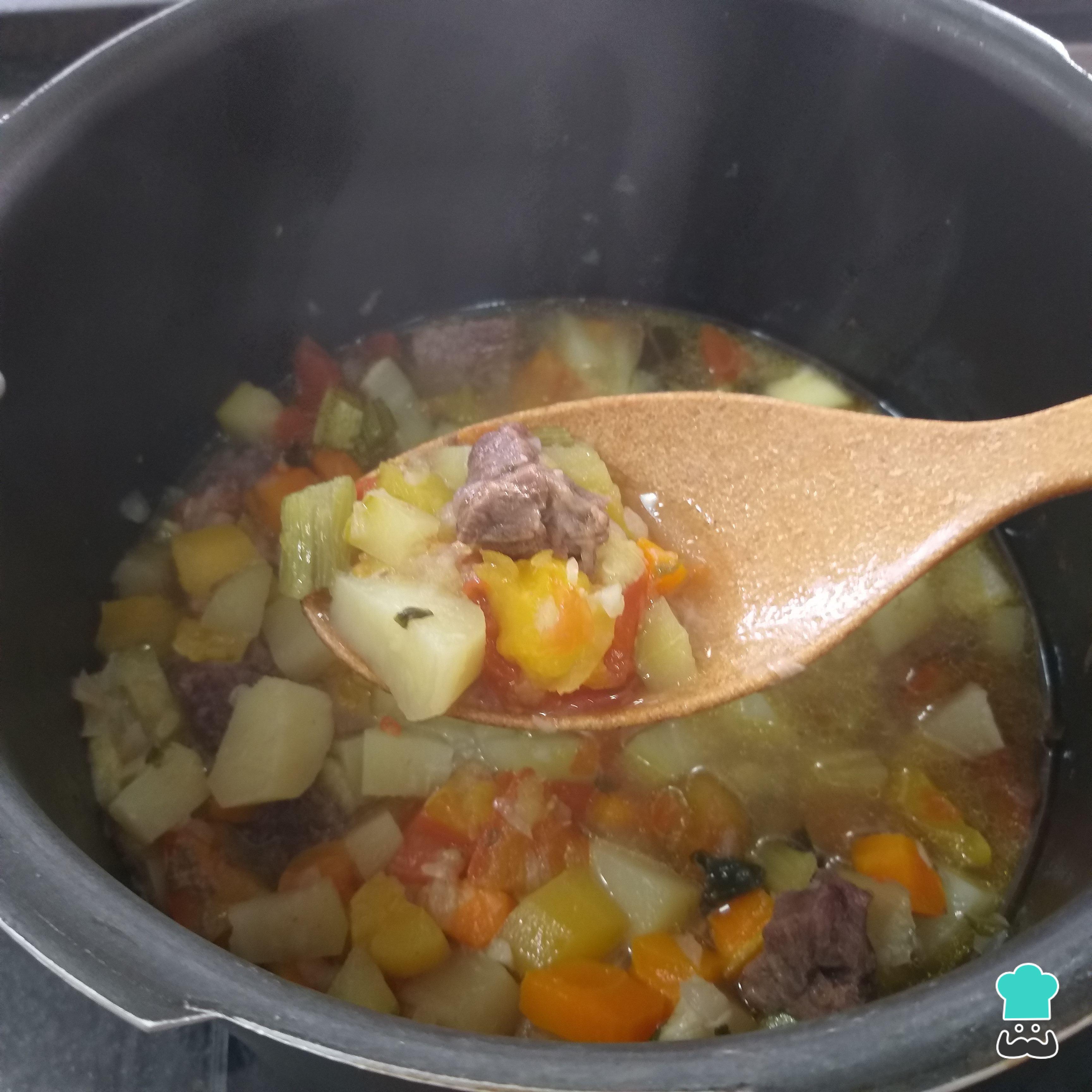 Espere a saída do vapor, abra a panela e confira que todos os legumes estão macios. Sirva o seu cozido a seguir!
