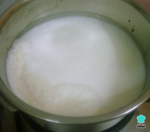 Para preparar cream cheese caseiro, comece por colocar o leite em uma panela até ferver. Retire do fogo, junte o vinagre de vinho branco e mexa por aproximadamente 5 minutos. Devolva a panela ao fogo e ferva por mais 5 minutos.