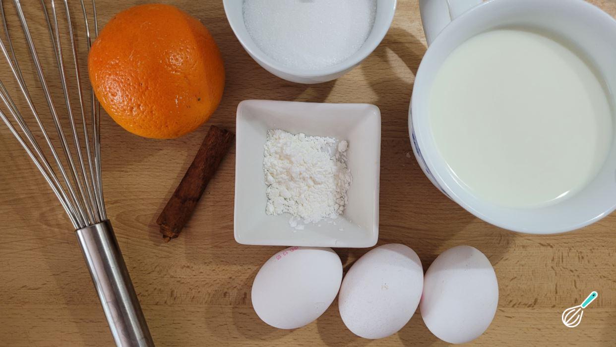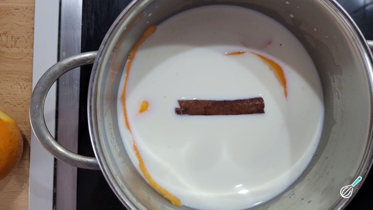 Em uma panela, coloque o leite para infusionar com a casca de laranja e a canela. Quando for cortar a casca da laranja, evite pegar a parte branca que pode amargar a receita. Ligue em fogo médio-baixo e deixe por cerca de 10 minutos, sem deixar ferver.
