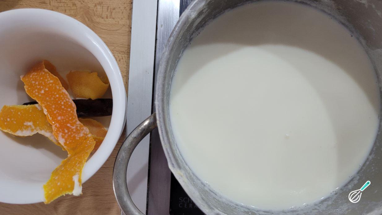 Quando o leite estiver com pequenas bolhas na superfície, retire as cascas de laranja e a canela.