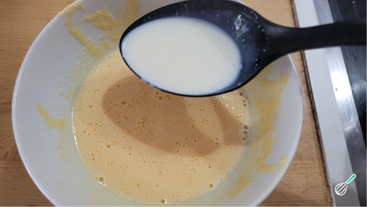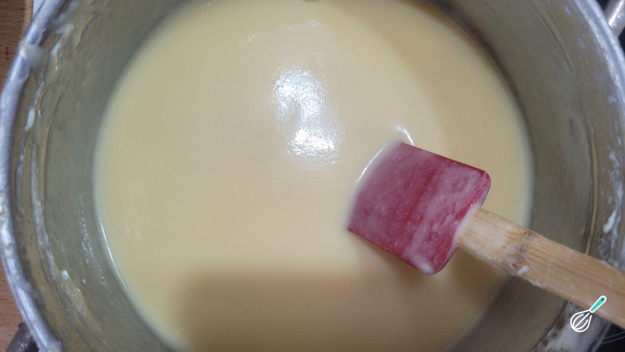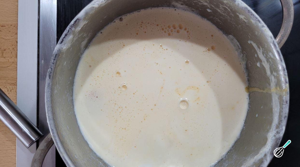 Coloque uma concha do leite quente sobre as gemas, mexendo muito bem com um batedor de arame imediatamente. Esse processo serve para temperar as gemas, para que a temperatura das gemas fique próxima da temperatura do leite na panela, evitando o choque que pode coagular os ovos.