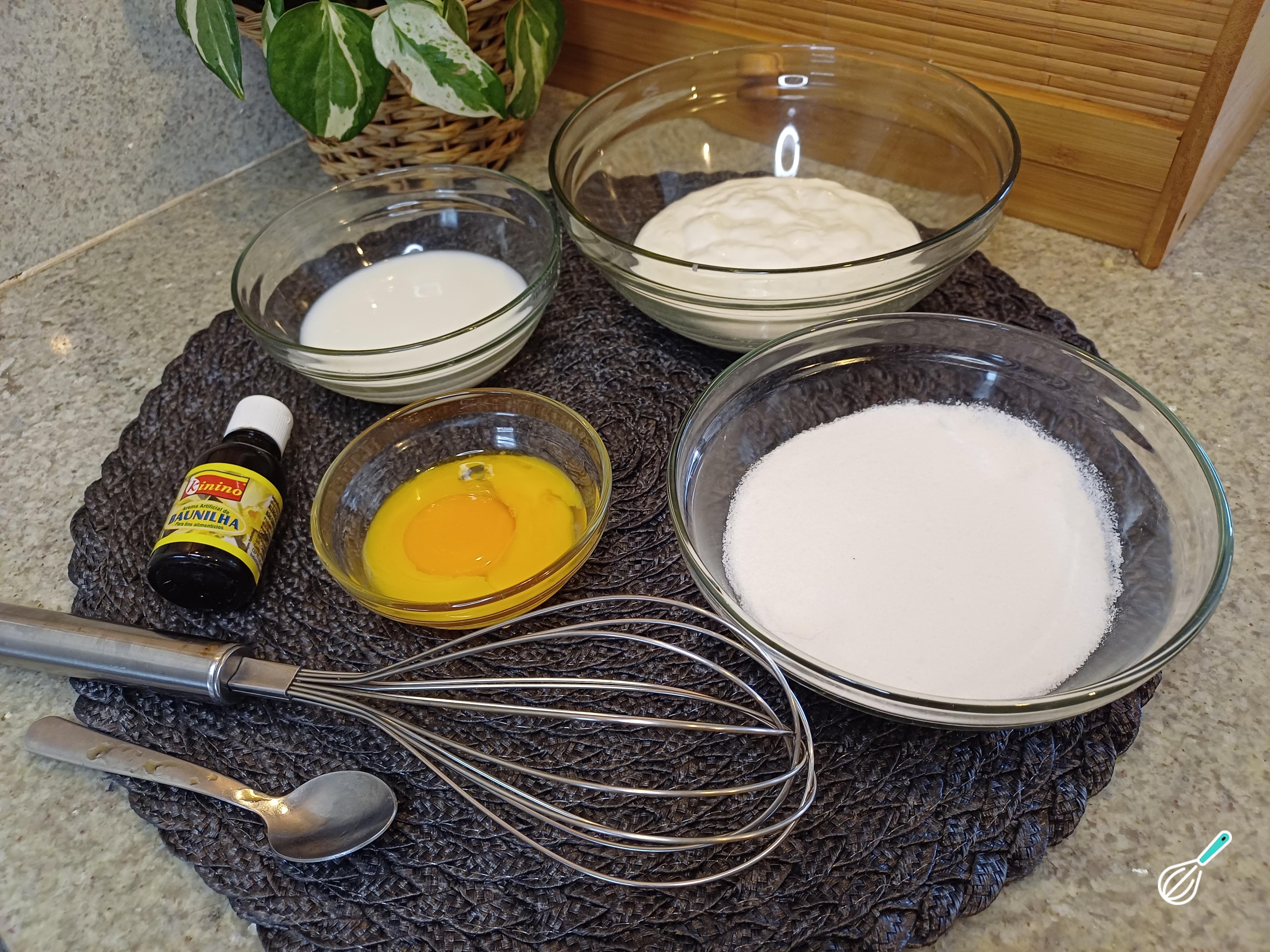 Separe todos os ingredientes e utensilios para o preparo do Crème Brûlée.