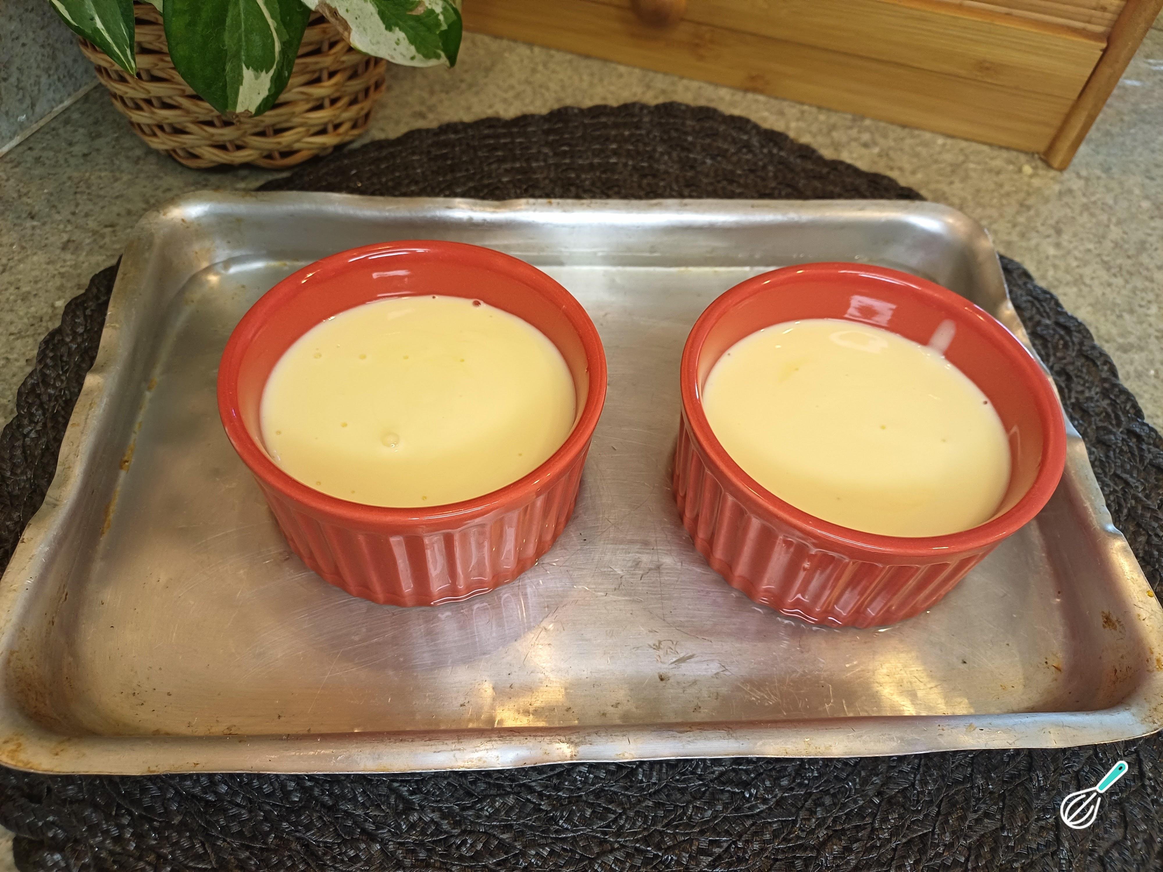 Coloque água fervente em uma assadeira, eles irão assar em banho-maria. Distribua com uma concha, a mistura em ramqeuins de cerâmica refratária (que possam ir no forno) até a borda. Coloque na assadeira e leve ao forno pré-aquecido a 140º por 40 minutos.