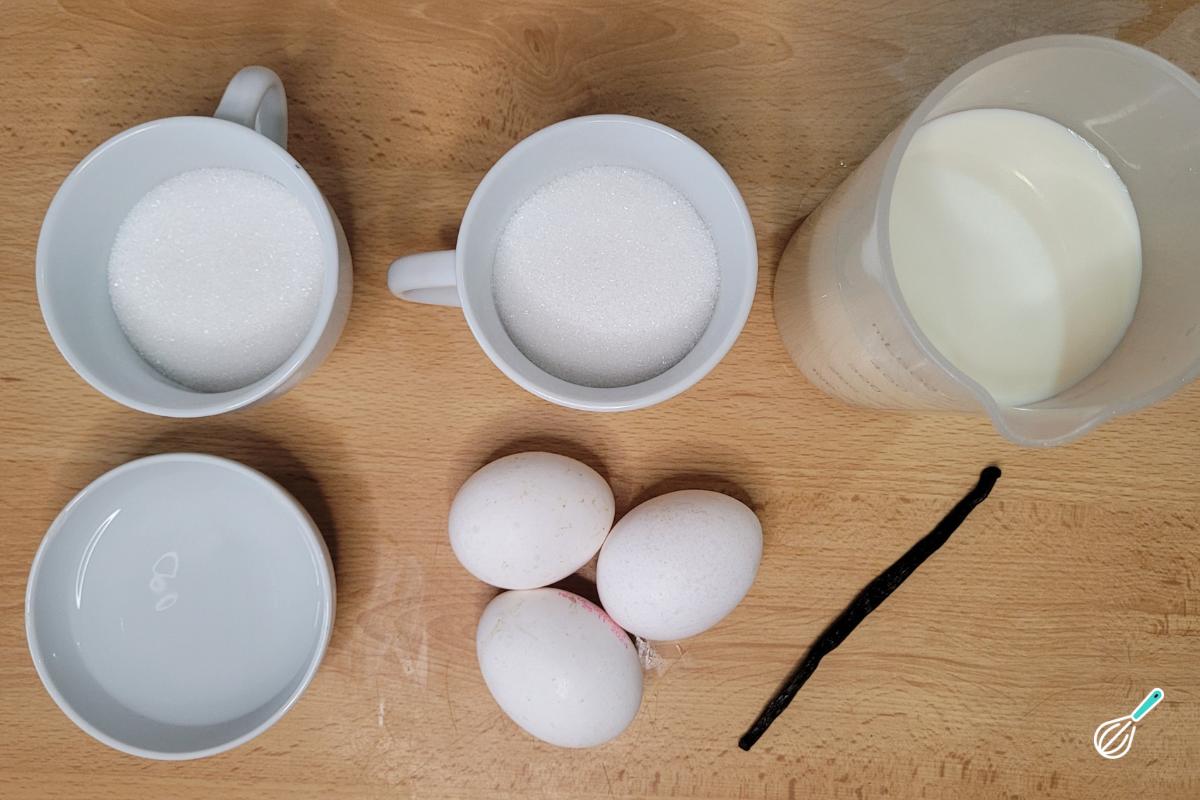 Separe os ingredientes para fazer o crème caramel. Você pode substituir a fava de baunilha pelo extrato de baunilha para uma opção mais econômica, mas uma das principais características do crème caramel é o sabor intenso da baunilha, assim como os pontinhos pretos da fava que aparecem no creme depois de assado, então se puder usar a fava, melhor. Outra opção é substituir por cumaru.