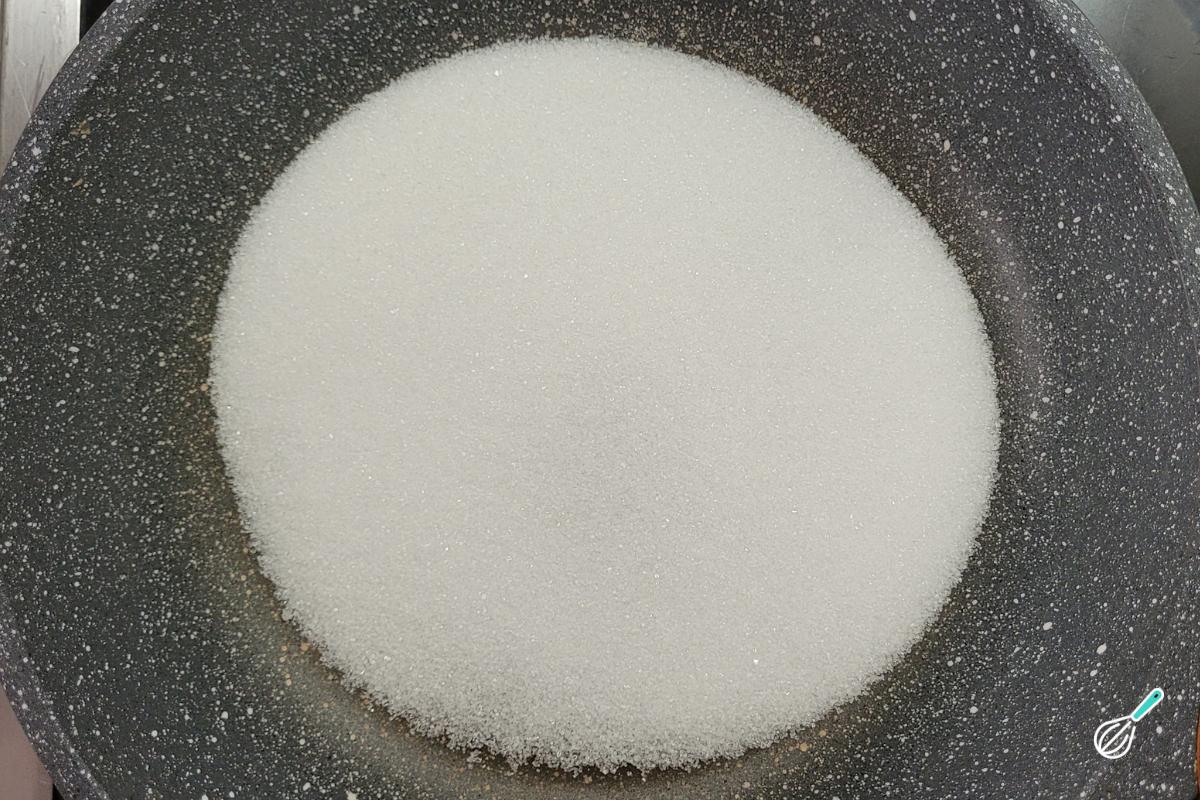 Vamos começar fazendo o caramelo. Em uma frigideira ainda fria, coloque o açúcar e a água, espalhando bem sobre o fundo da frigideira. Ligue em fogo médio e espere o açúcar derreter, sem mexer para evitar que cristalize.