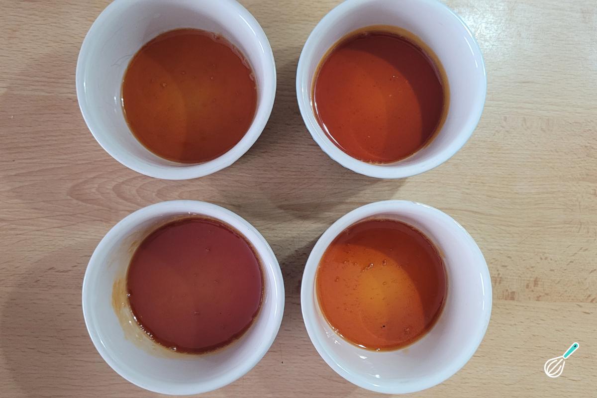 Verta rapidamente o caramelo sobre os ramequins ou forminhas que irão para o forno, espalhando sobre o fundo.